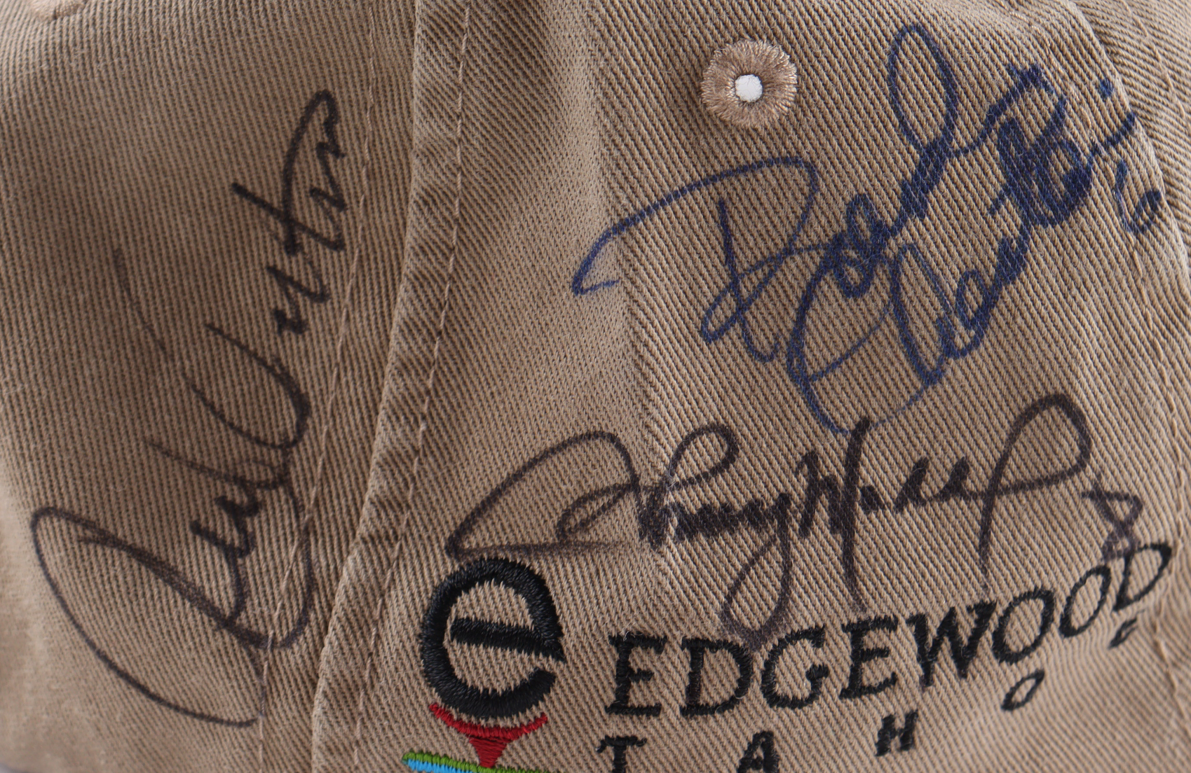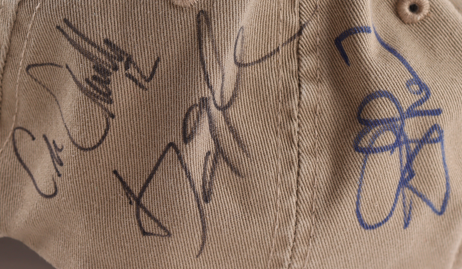 Other notable names on the hat include Ben Roethlisberger, Jabre Barber, Mike Eruzione, Chris Chandler, Dan Quayle, Dan Patrick, Joe Theismann, Rick Pitino, Brandi Chastain, Tommy Maddox,