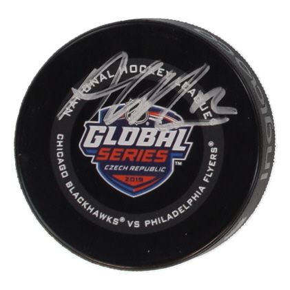 2019 Global Series Logo Hockey Puck. Hand-signed by Alex DeBrincat (Chicago Blackhawks).