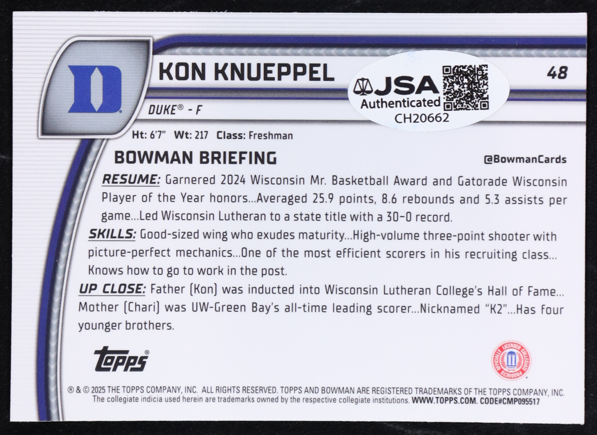 Kon Knueppel Signed 2024-25 Bowman Chrome University #48 (JSA)