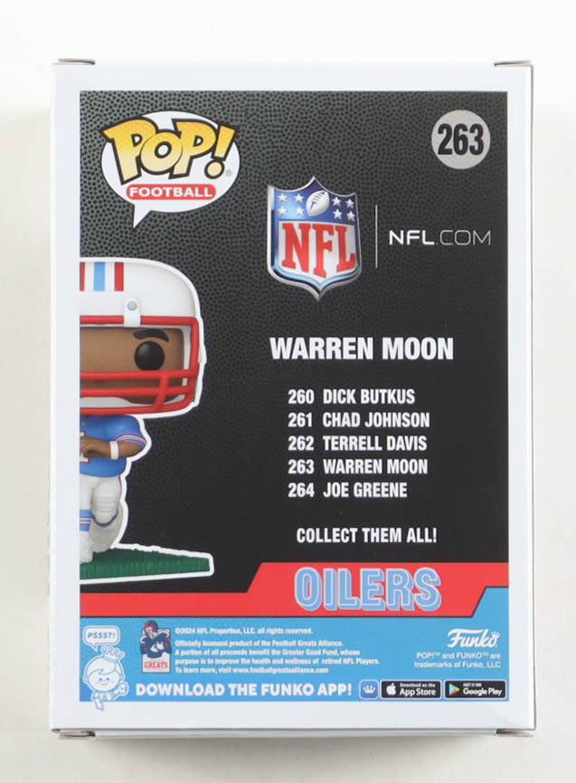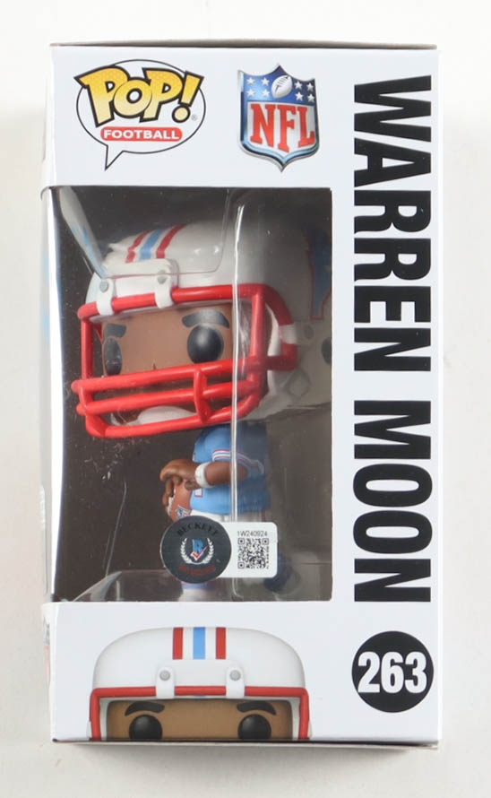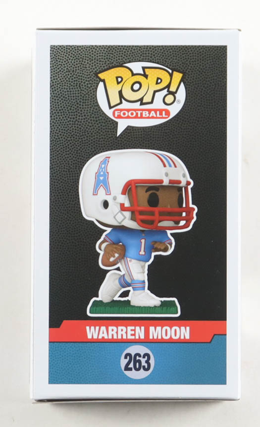 Funko Pop! vinyl figure measures approximately 4" in height and has been hand-signed and inscribed on the packaging by Warren Moon (Houston Oilers, HOF).