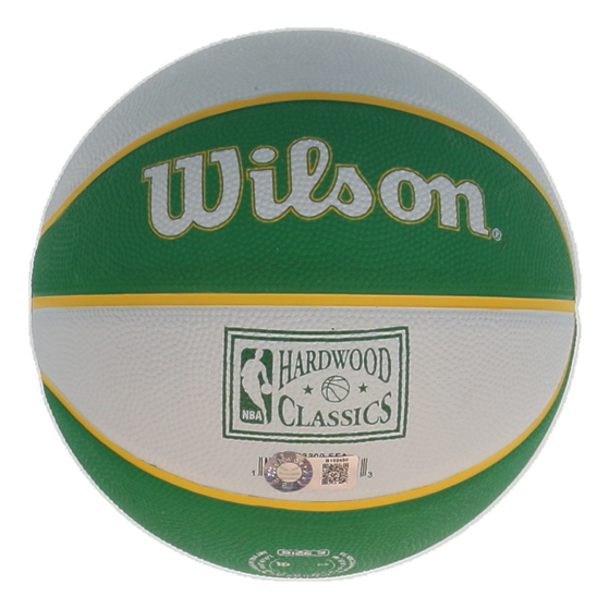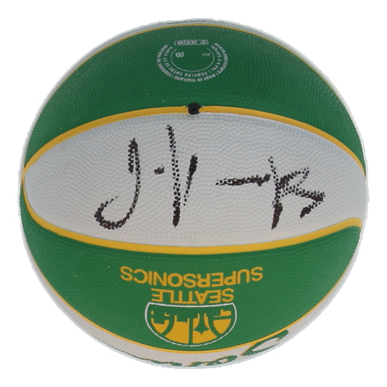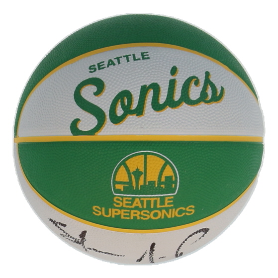 Wilson Seattle SuperSonics mini basketball has been hand-signed by Shawn Kemp (Seattle Seahawks, HOF). Please note the fading signature.