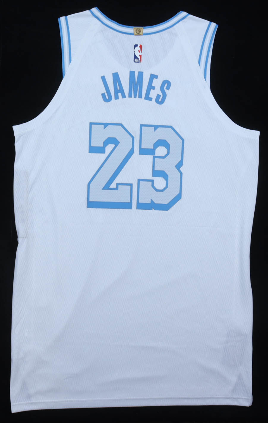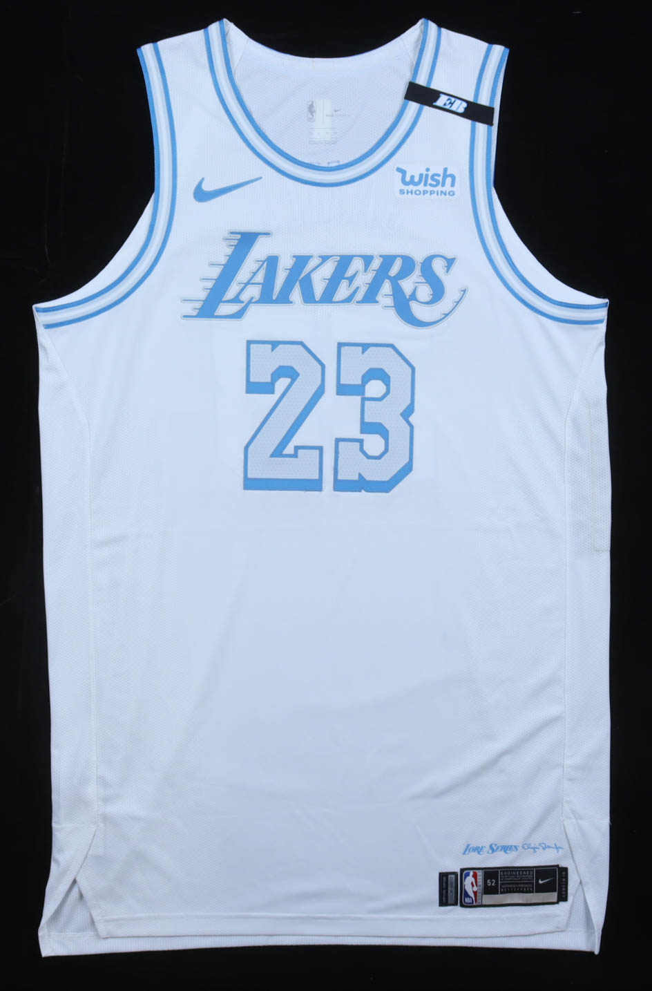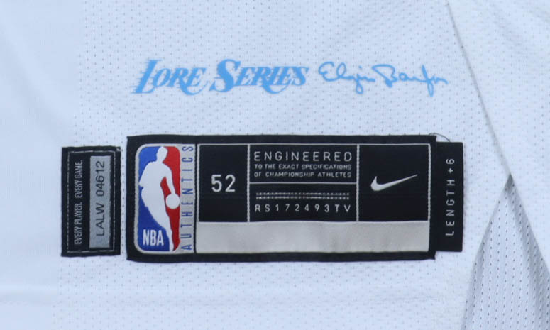 -White City Edition jersey, is the NBA AUTHENTICS / Nike size 52 label, with a tag attached: LENGTH +6. Adjacent NBA code label: LALW04612.