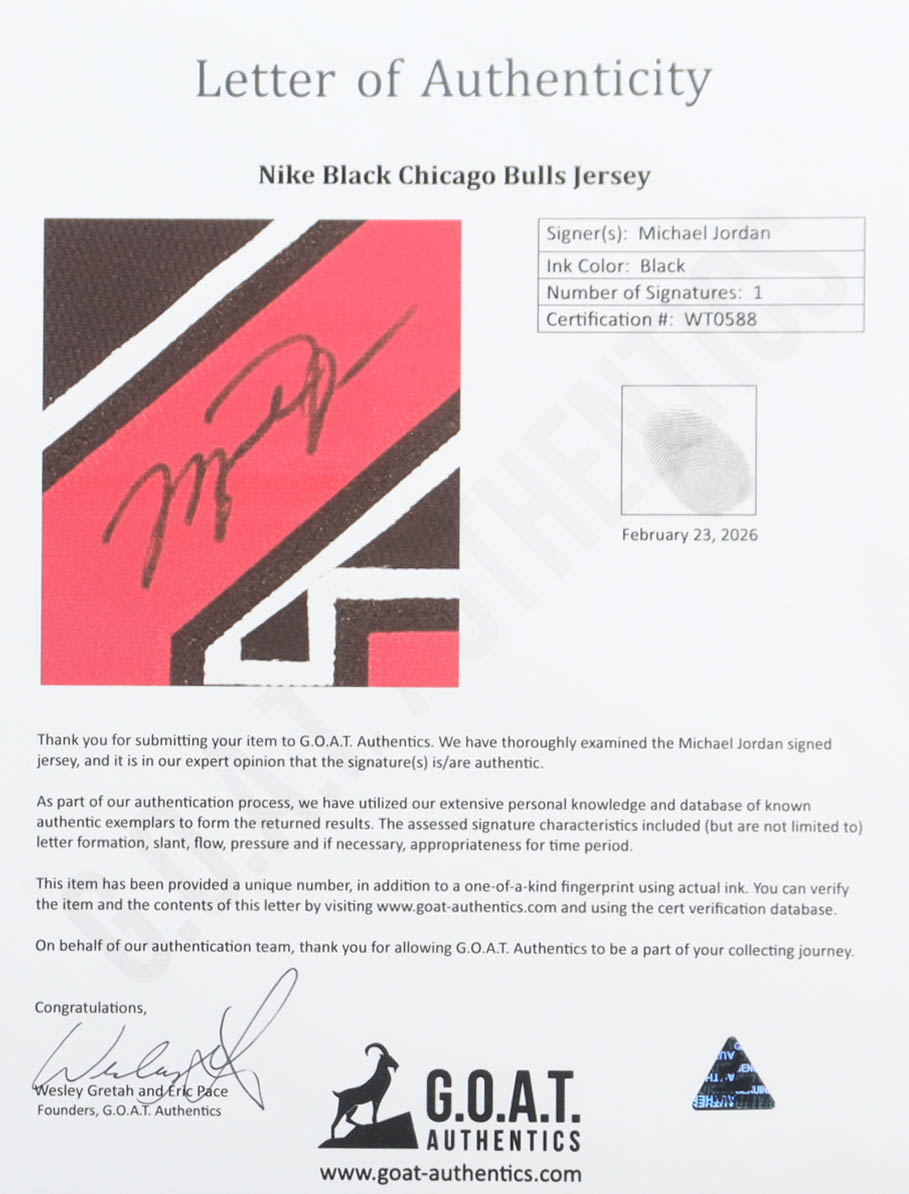 This Michael Jordan autograph has been reviewed and approved by G.O.A.T. Authentics, who are widely recognized as the foremost expert in Michael Jordan autographs.
