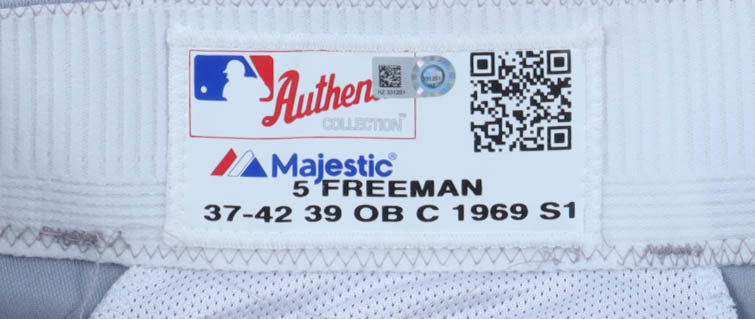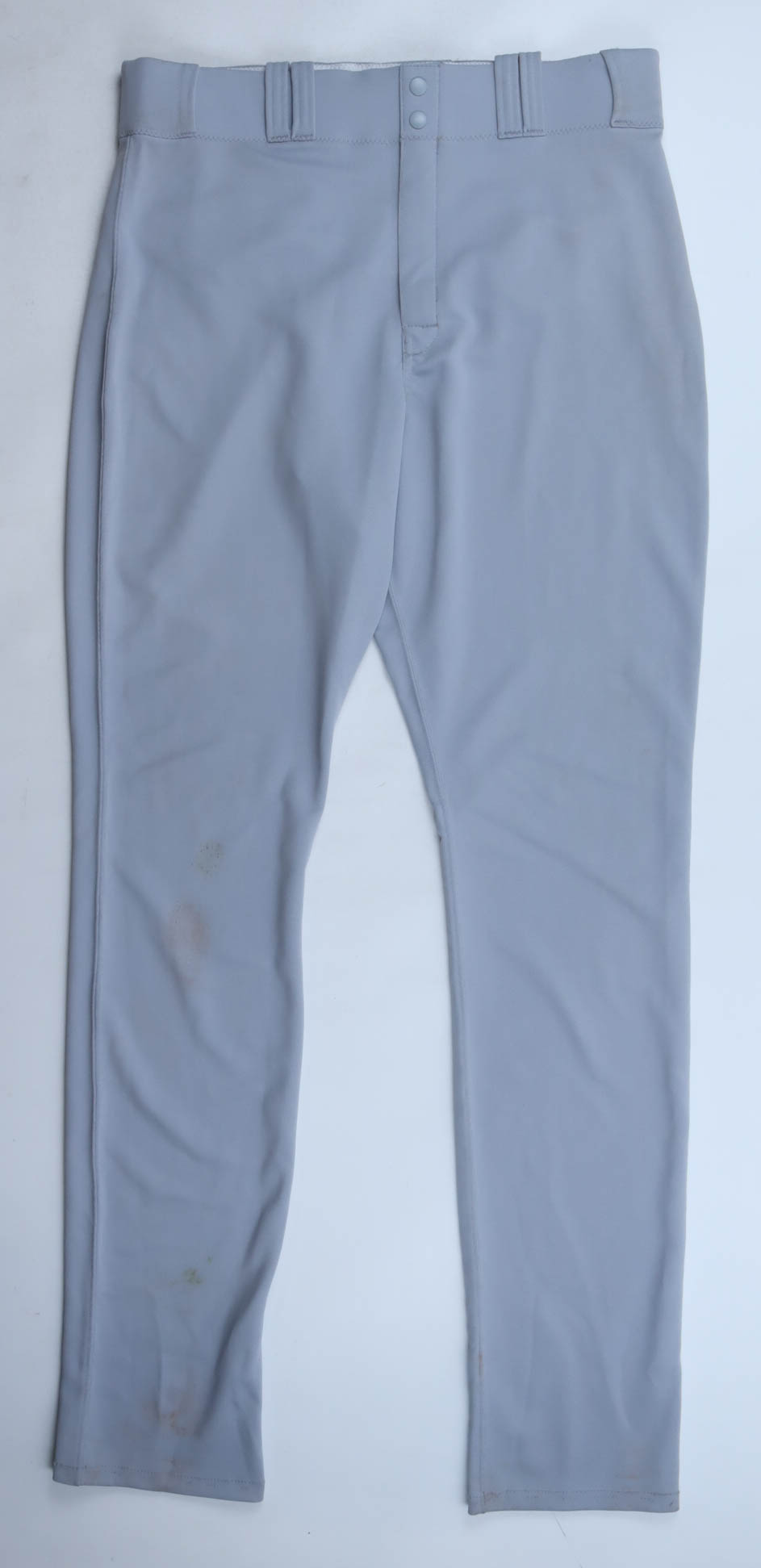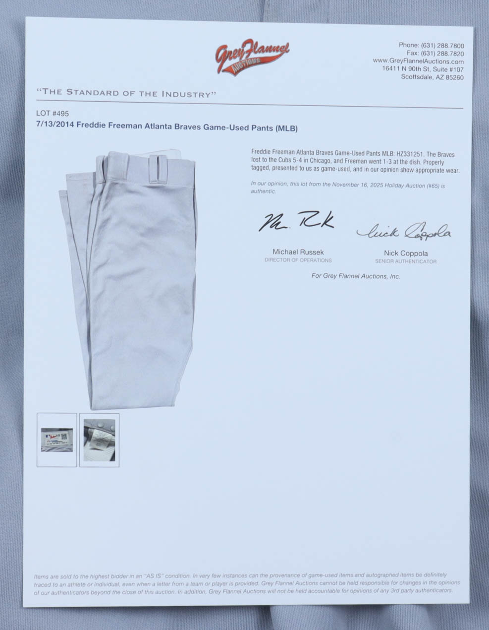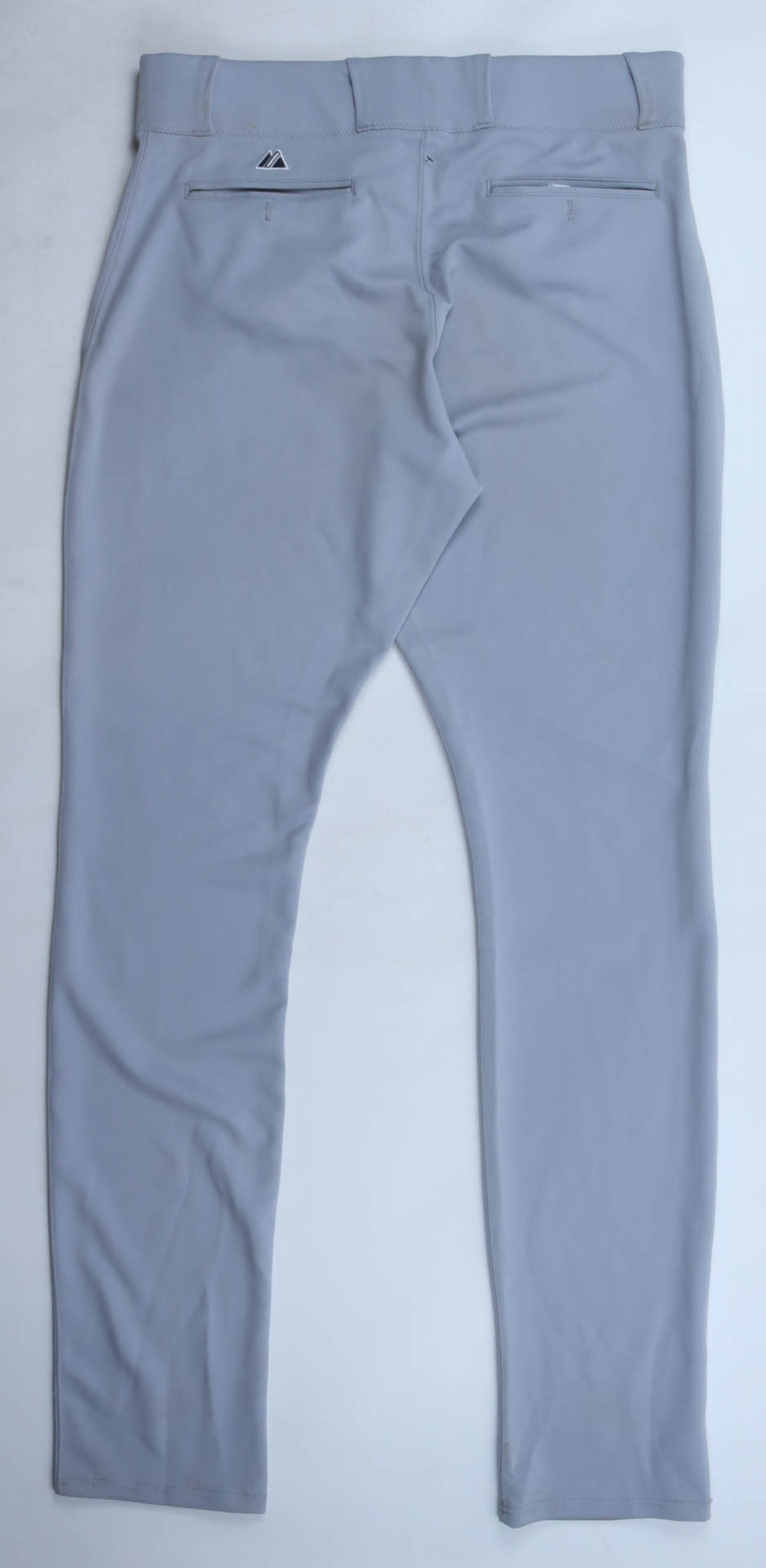 Majestic pants. Size 37-42. These road grey pants were worn by Freddie Freeman on 07/13/2014 during the Braves vs. Cubs game. The pants shows signs of in-game use on the pant legs.
