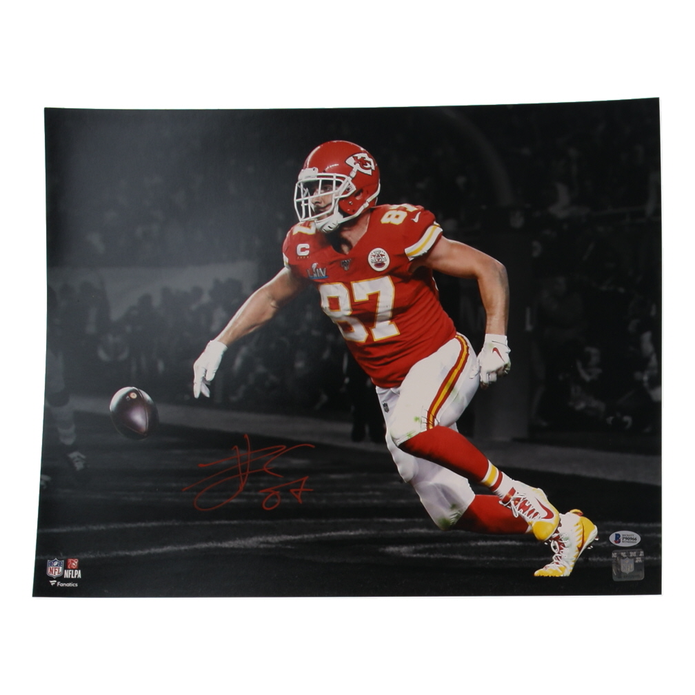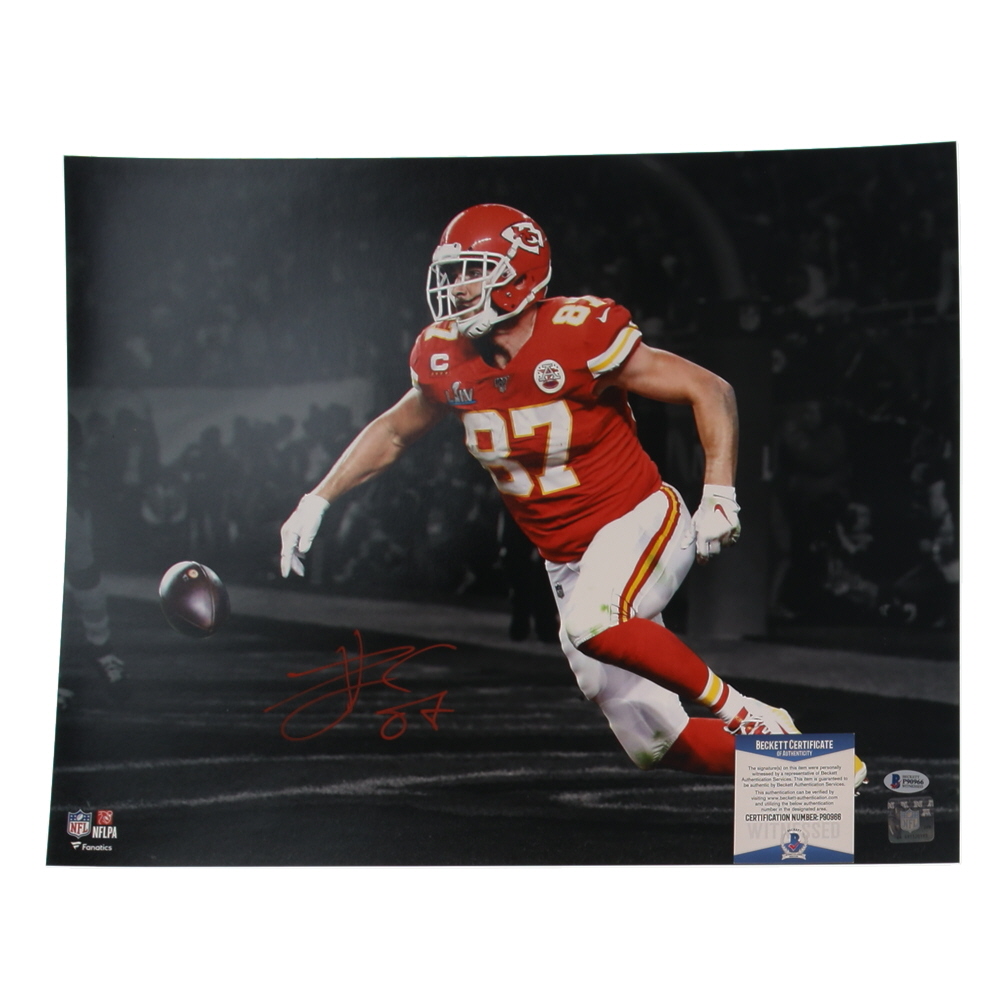 Photo measures 16" x 20" in size. Hand-signed by Travis Kelce (Kansas City Chiefs).