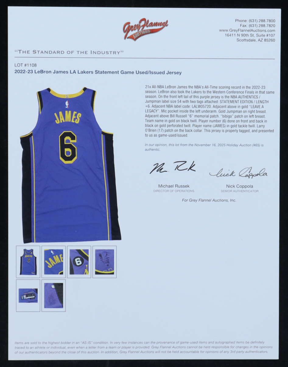 LeBron James 2022-23 Lakers Game-Used Jordan Statement Authentic Jersey (Grey Flannel)