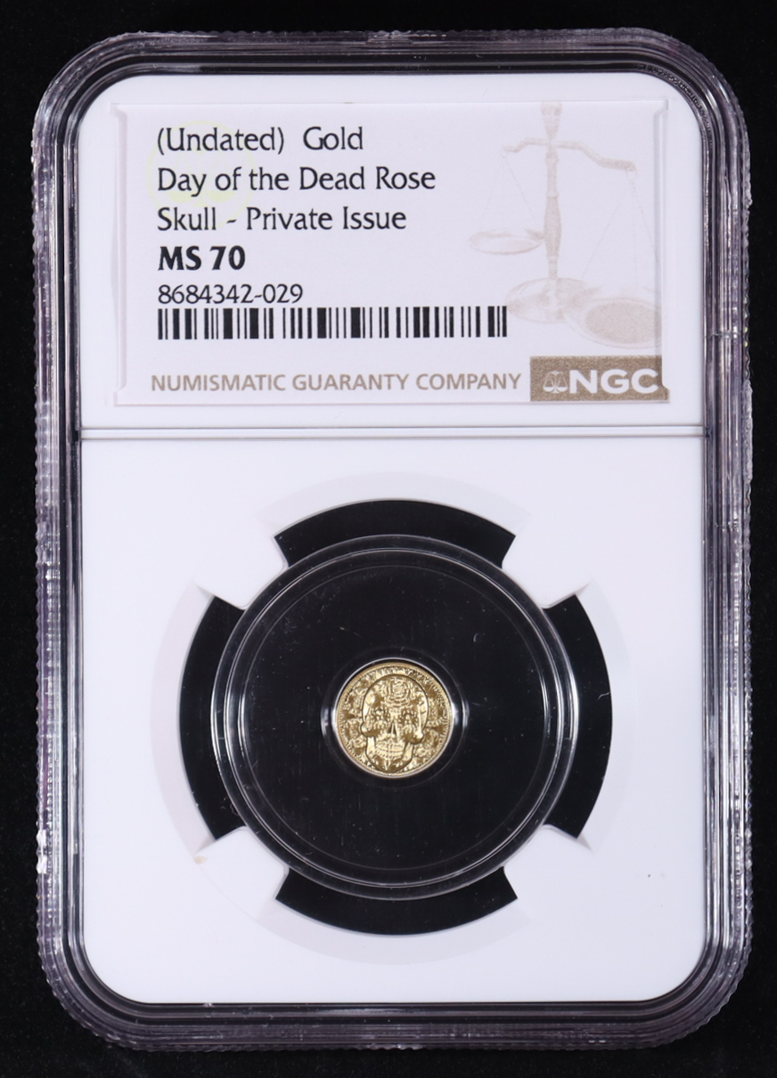 Day of the Dead Rose Skull 1/200oz .999 Fine Gold Private Issue Coin (NGC MS70)