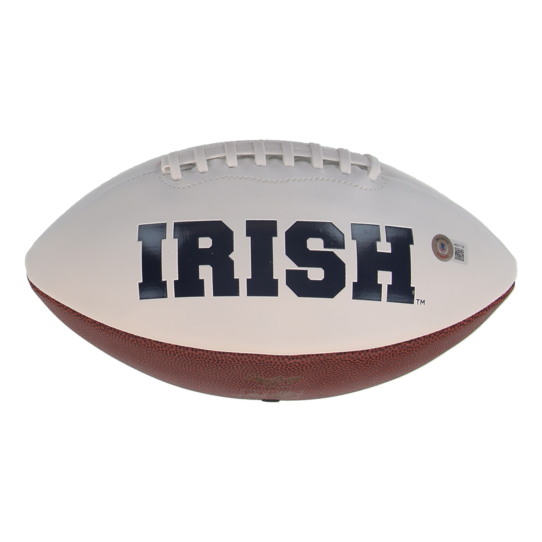 Rawlings Notre Dame Fighting Irish Logo Football. Hand-signed and inscribed by Rudy Ruettiger. Please note, the signature has been smudged, there are stains throughout the football, and it does not fully inflate.