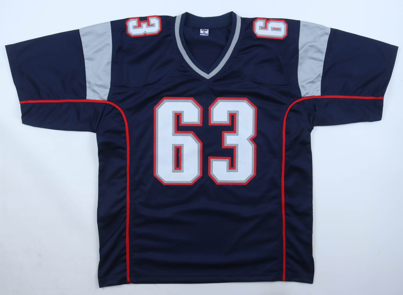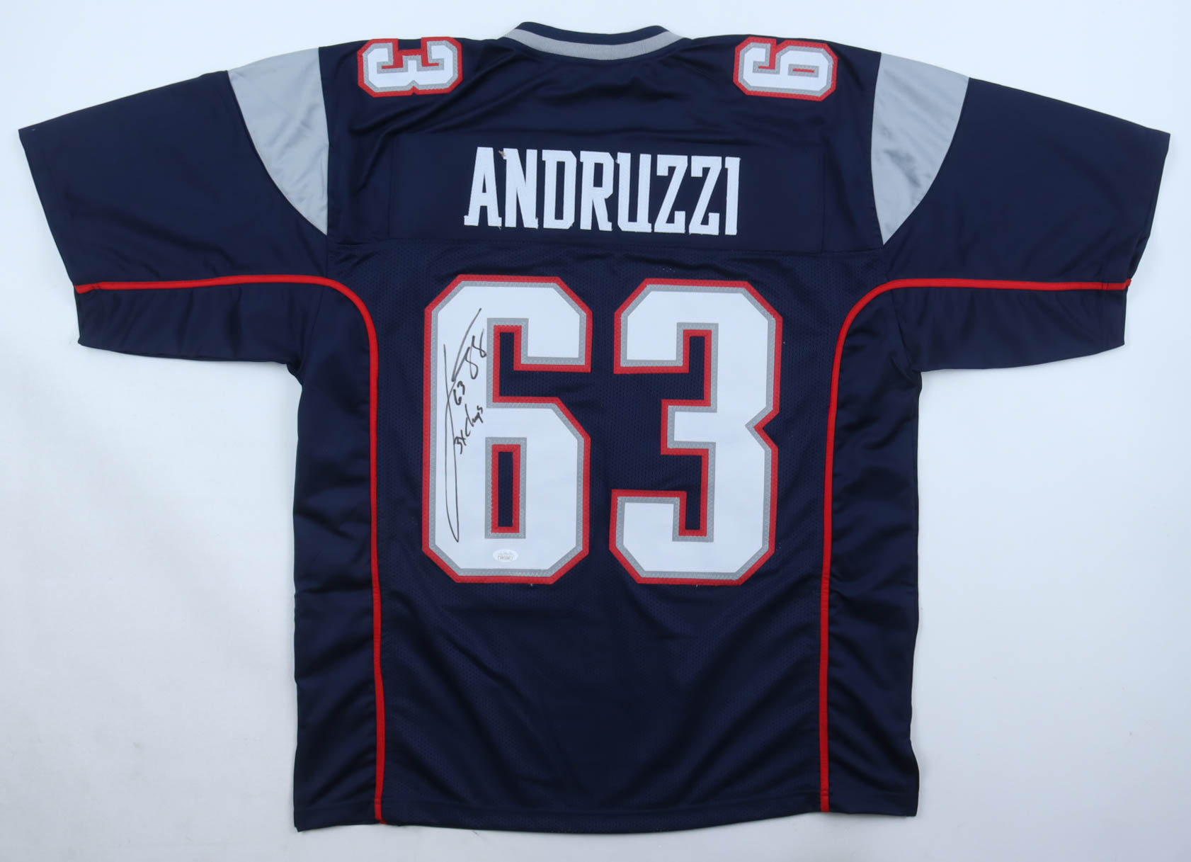Custom jersey. Everything is sewn on, size XL. Hand-signed and inscribed by Joe Andruzzi. Please note, glue is visible through the jersey numbers. See photos regarding the condition of the item.