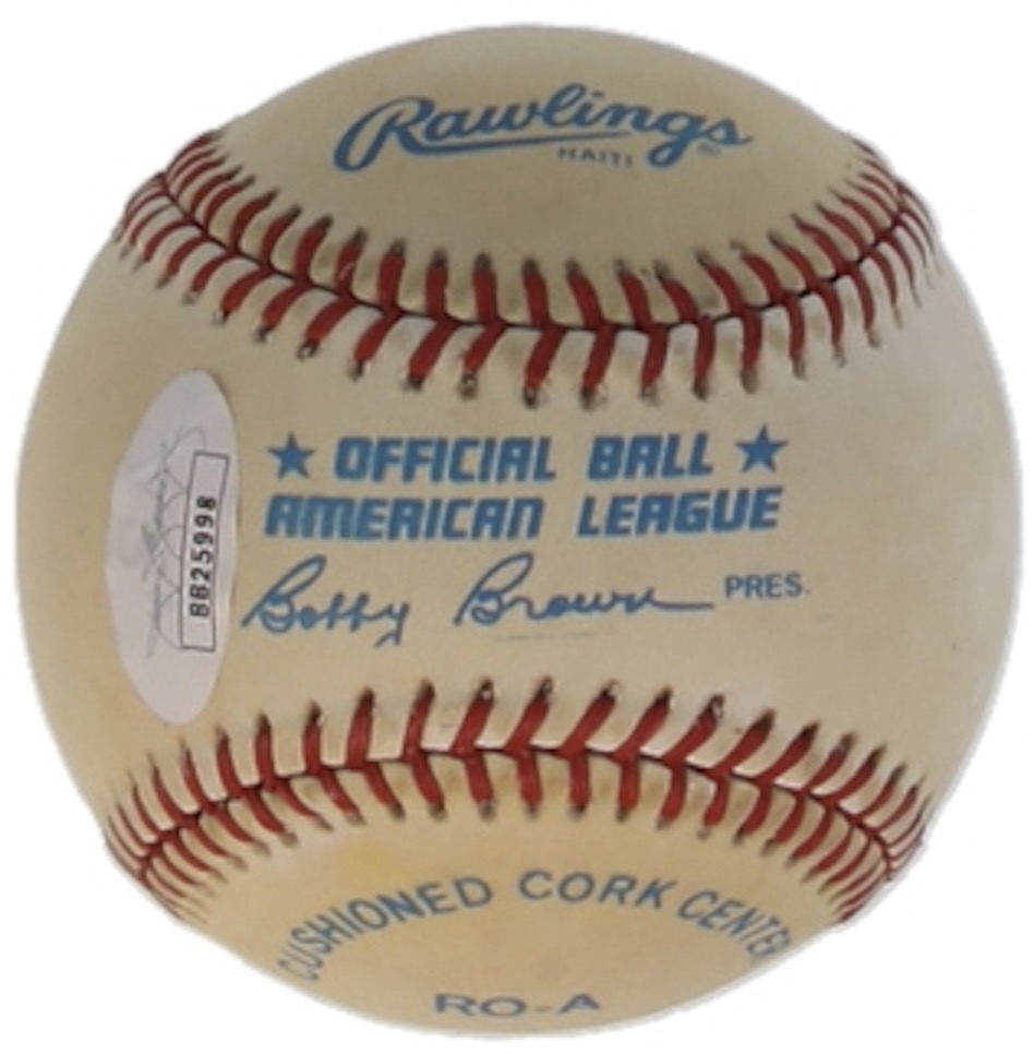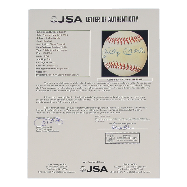 Rawlings Official American League baseball has been hand-signed by Mickey Mantle (D. 1995, New York Yankees, HOF).