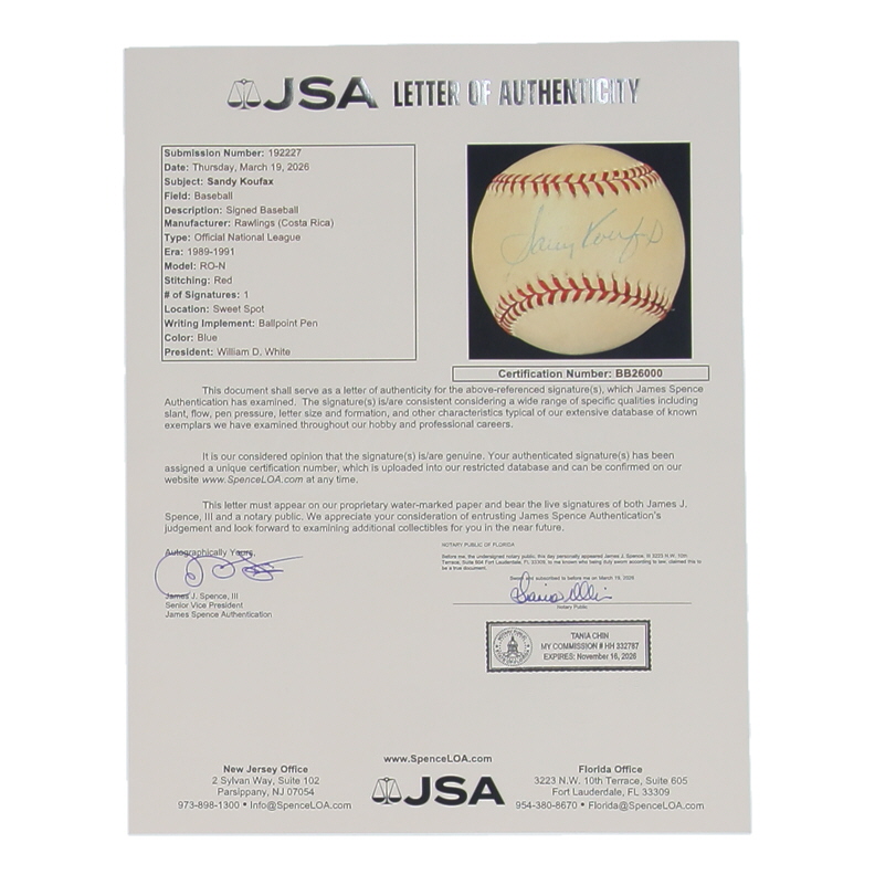Rawlings Official National League baseball. Hand-signed by Sandy Koufax (Brooklyn Dodgers, HOF).