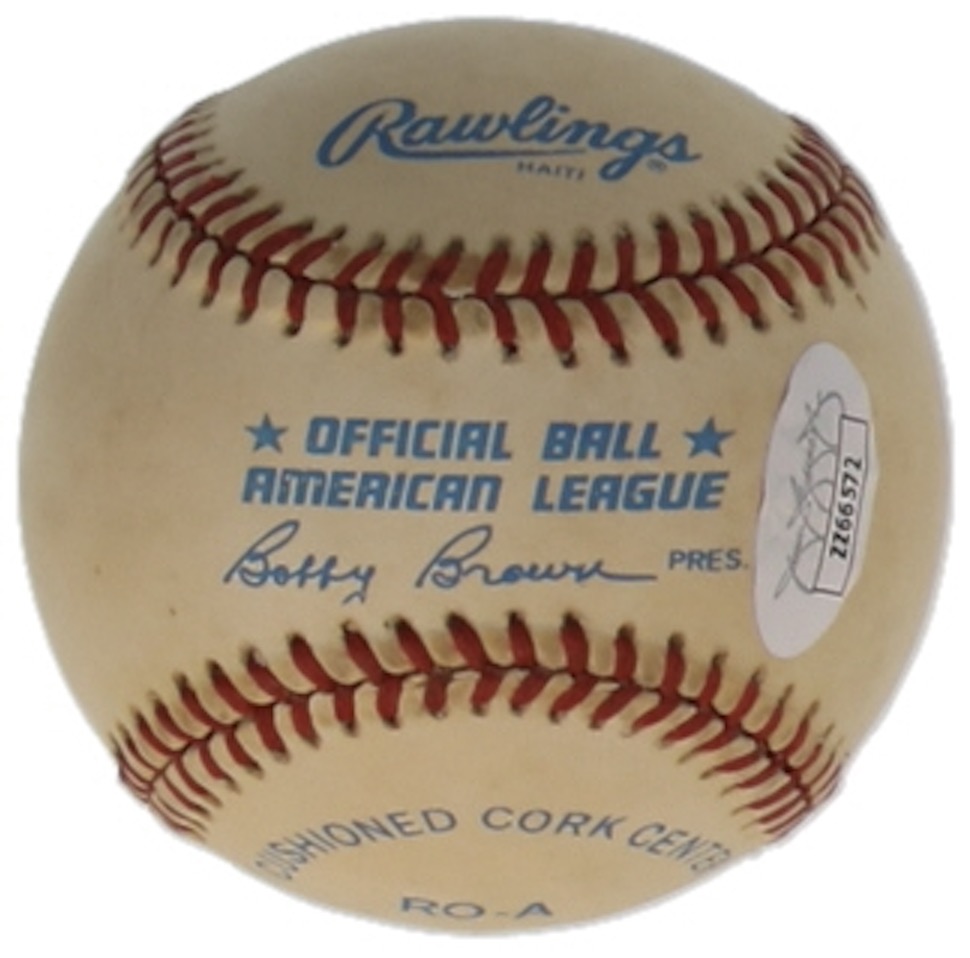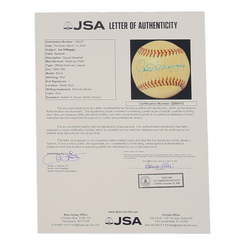 Rawlings Official American League baseball. Hand-signed by Joe DiMaggio (D. 1999, New York Yankees, HOF).