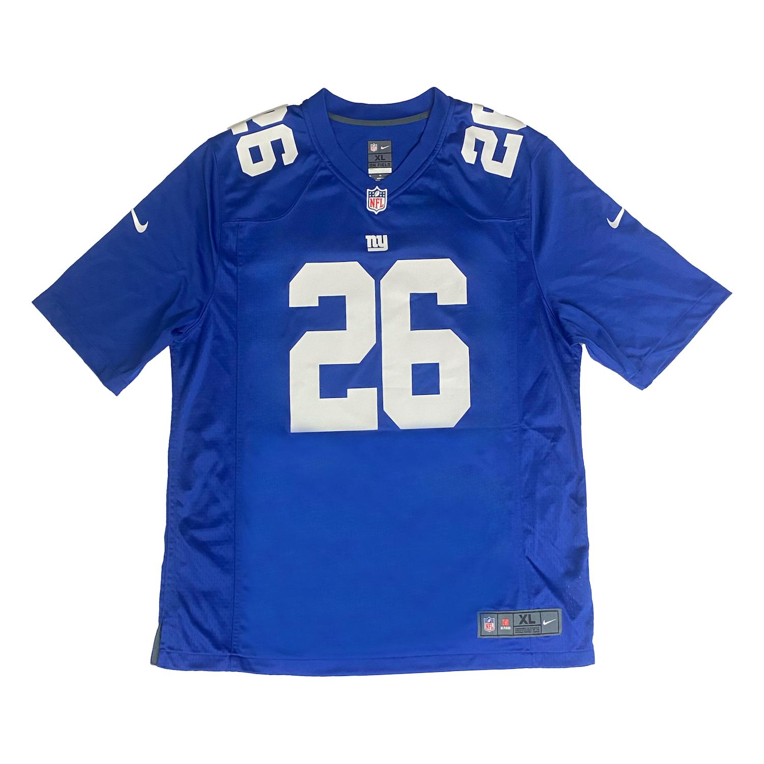 Nike football jersey. Everything pressed on, size XL. Hand-signed and inscribed by Saquon Barkley (New York Giants). The jersey is limited edition and hand-numbered #126/126.