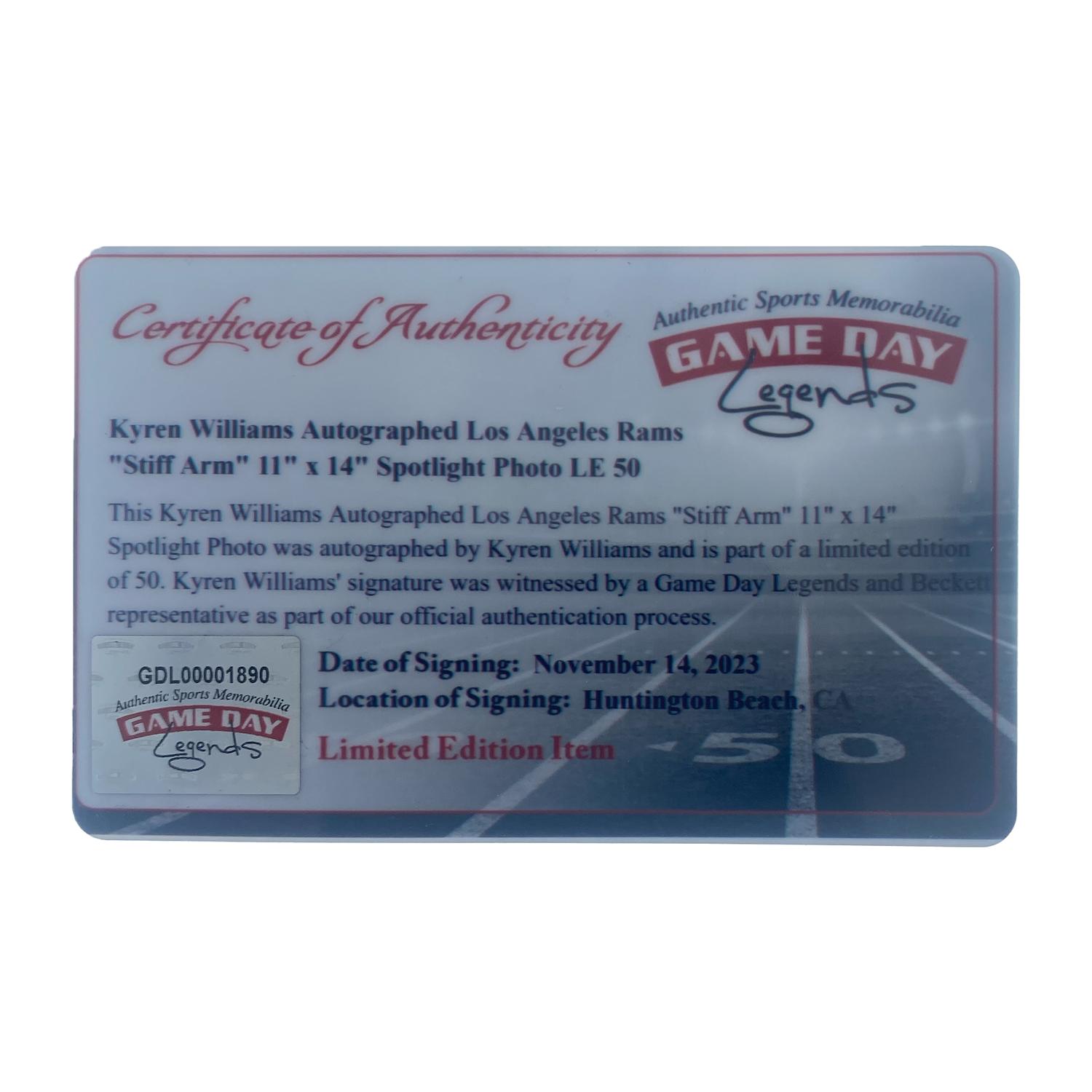 Photo measures 11" x 14" in size and has been hand-signed by Kyren Williams (Los Angeles Rams). The photo is limited edition and numbered #23/50.