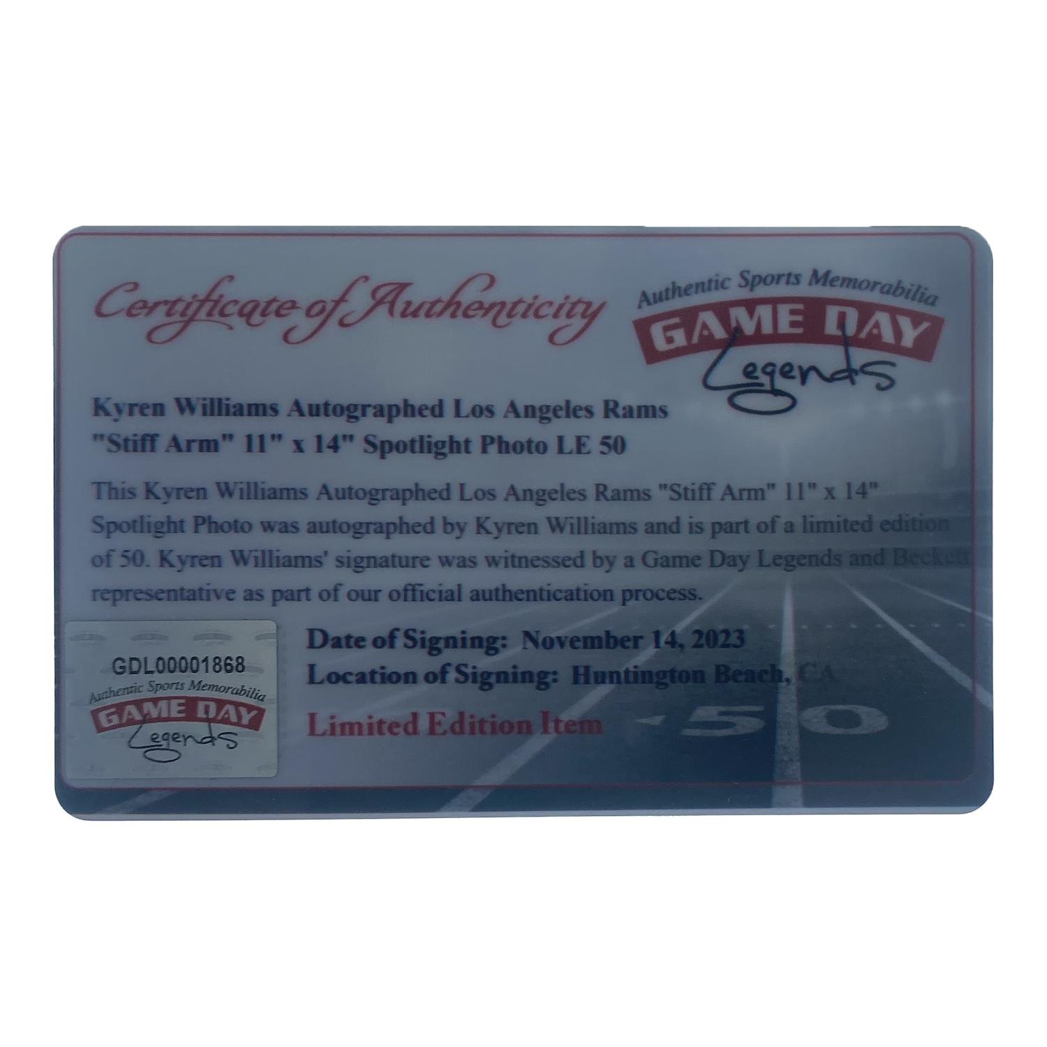 Photo measures 11" x 14" in size and has been hand-signed by Kyren Williams (Los Angeles Rams). The photo is limited edition and numbered #1/50.