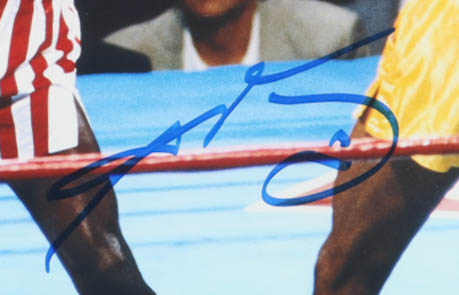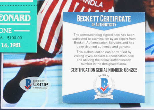 Custom frame measures approximately 13" x 16" in size and features an 8" x 10" photo that has been hand-signed Sugar Ray (D. 1989, HOF). Display also includes an original 1981 Caesars Palace Ticket.