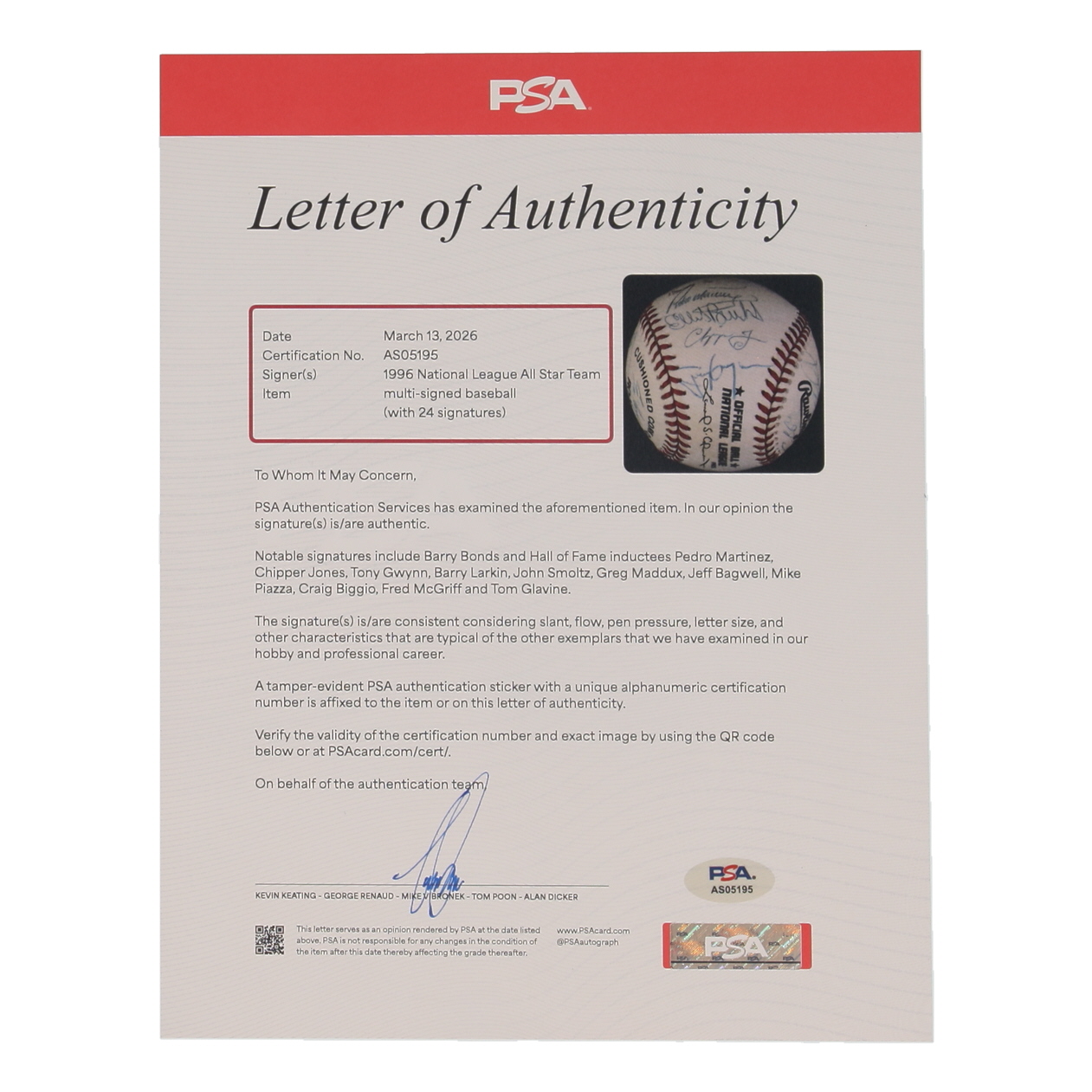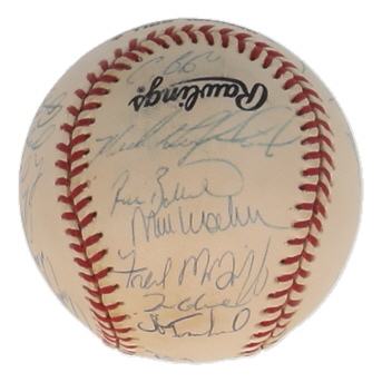 1996 NL All-Star Team ONL Baseball Signed by (24) with Barry Bonds, Pedro Martinez, Chipper Jones, Tony Gwynn (PSA)