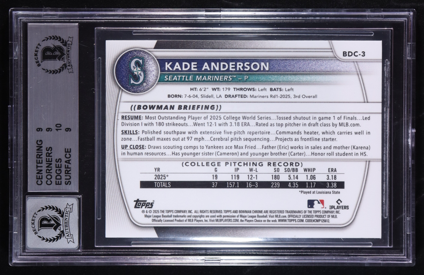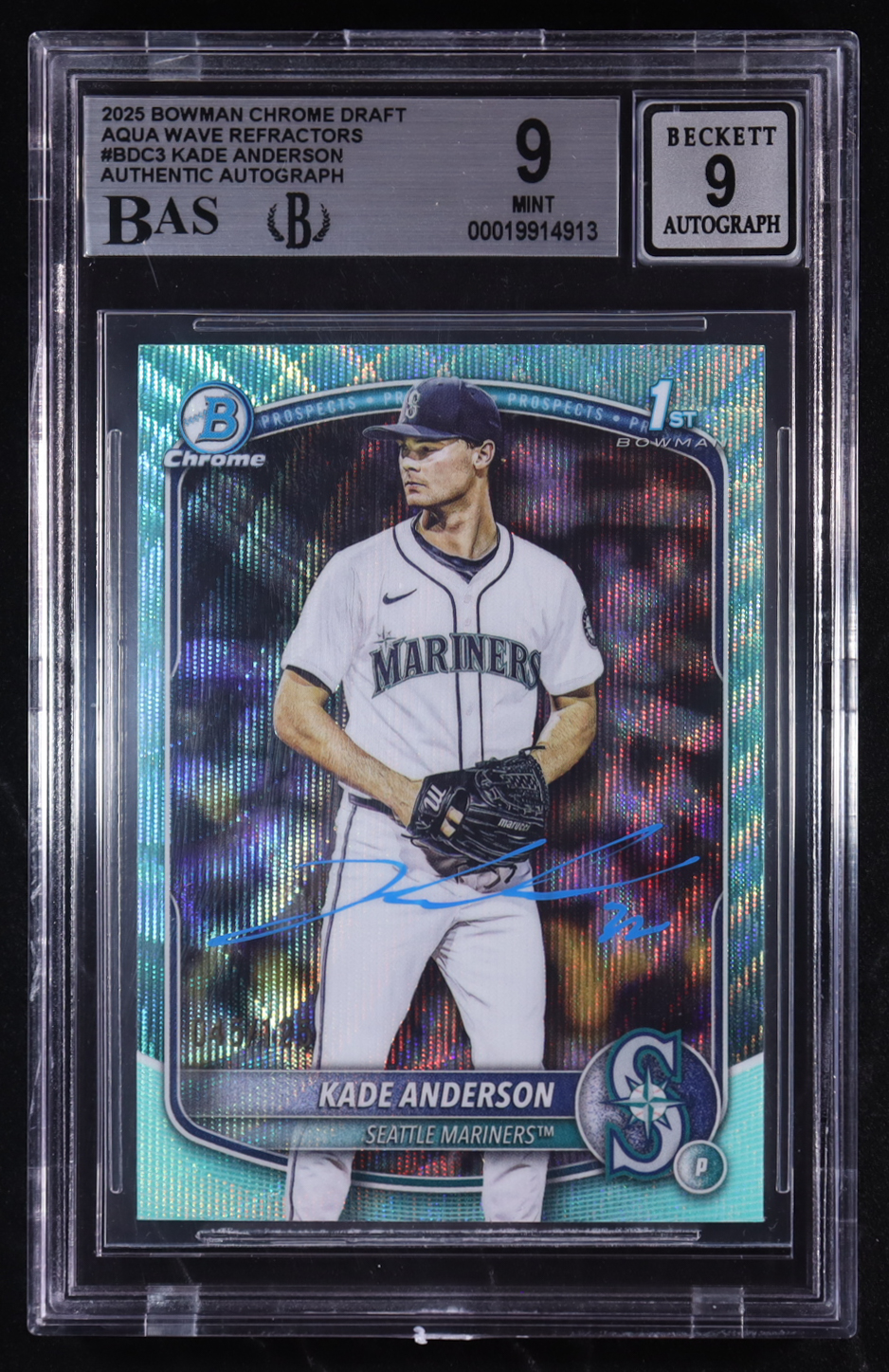Kade Anderson Signed 2025 Bowman Chrome Draft Aqua Wave Refractors #BDC3 #045/125 (BAS 9 | Autograph Graded 9)