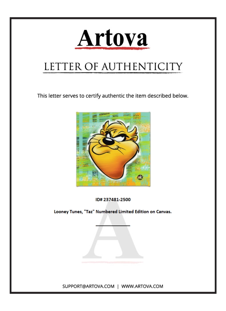 "Taz" is a limited edition giclee on gallery wrapped canvas by Looney Tunes. This piece comes from an edition of 500 and bears an imprint of Looney Tunes' official seal. Includes Certificate of Authenticity. Measures approx. 10" x 10" (image)
