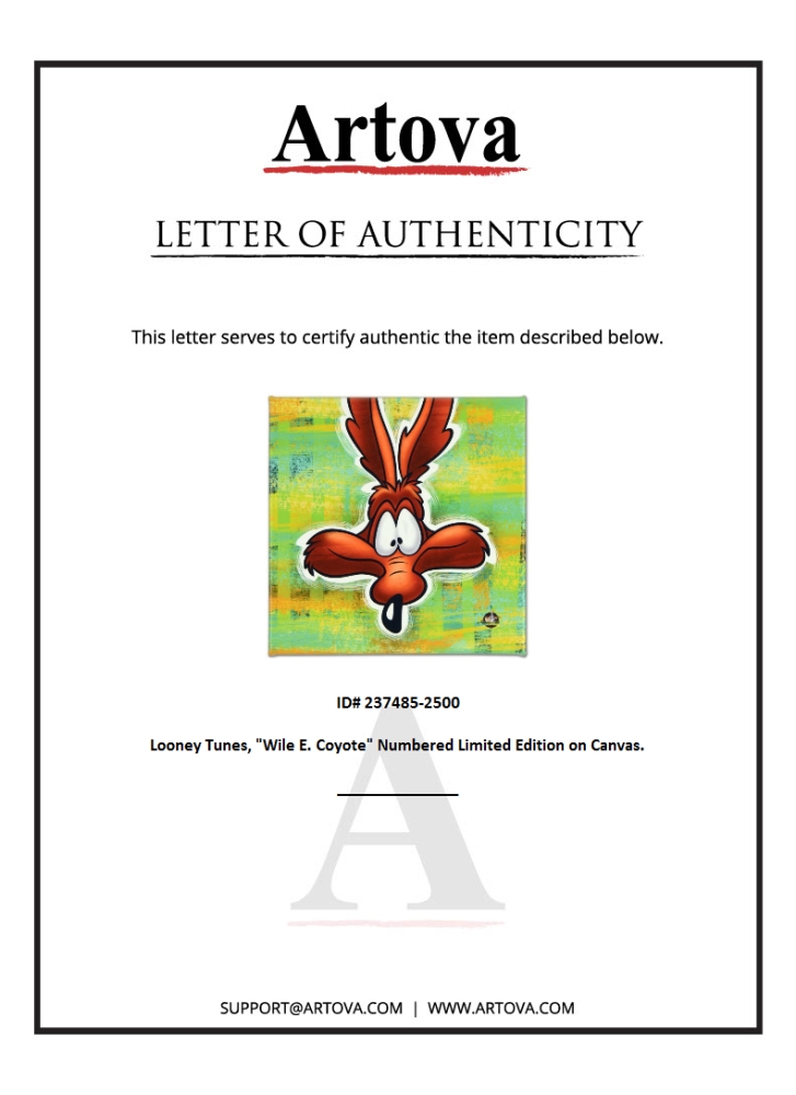 "Wile E. Coyote" is a limited edition giclee on gallery wrapped canvas by Looney Tunes. This piece comes from an edition of 500 and bears an imprint of Looney Tunes' official seal. Includes Certificate of Authenticity. Measures approx. 10" x 10" (image)