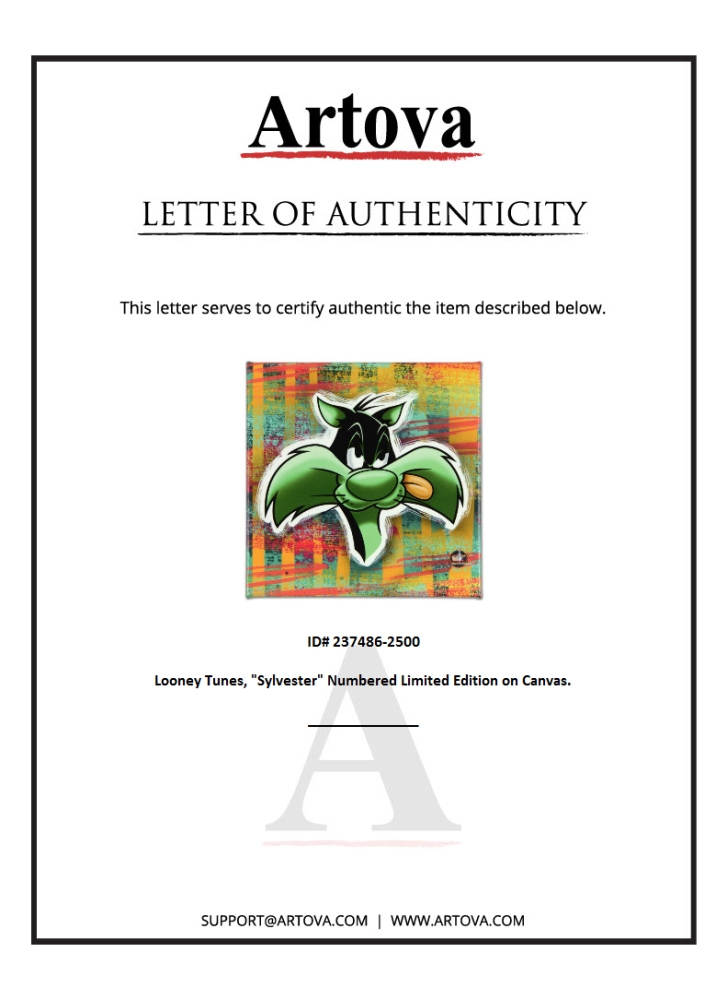 "Sylvester" is a limited edition giclee on gallery wrapped canvas by Looney Tunes. This piece comes from an edition of 500 and bears an imprint of Looney Tunes' official seal. Includes Certificate of Authenticity. Measures approx. 10" x 10" (image)