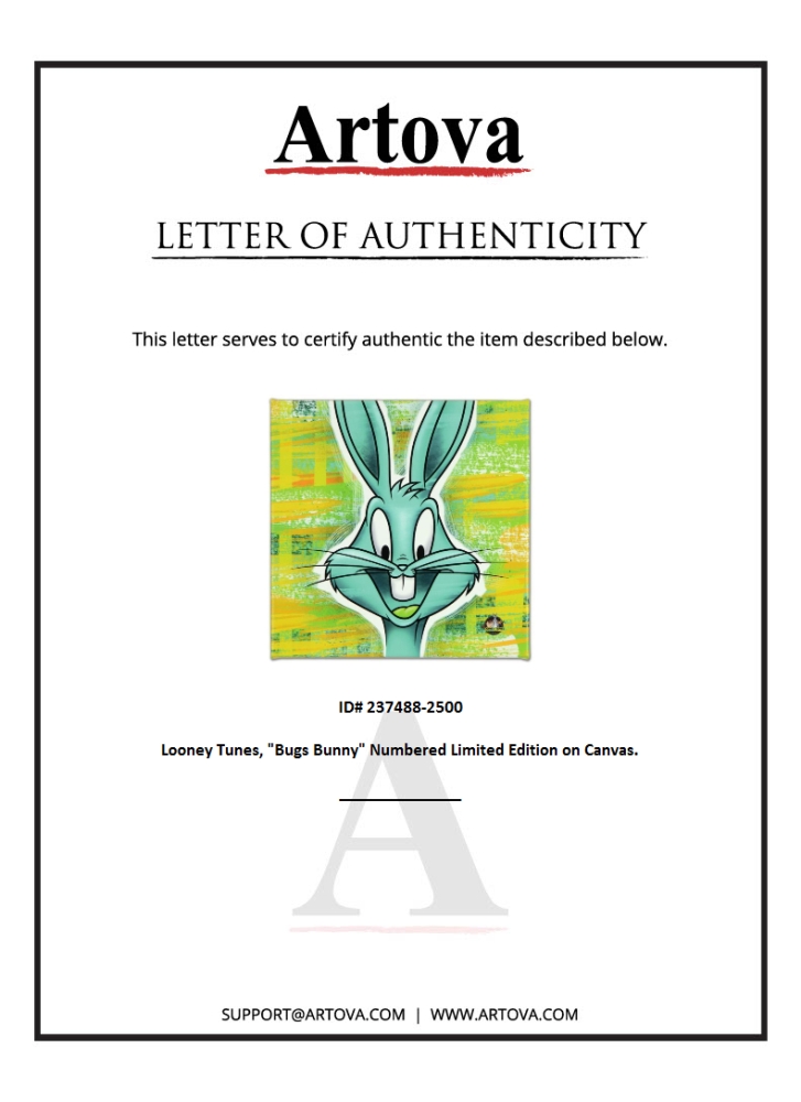 "Bugs Bunny" is a limited edition giclee on gallery wrapped canvas by Looney Tunes. This piece comes from an edition of 500 and bears an imprint of Looney Tunes' official seal. Includes Certificate of Authenticity. Measures approx. 10" x 10" (image)