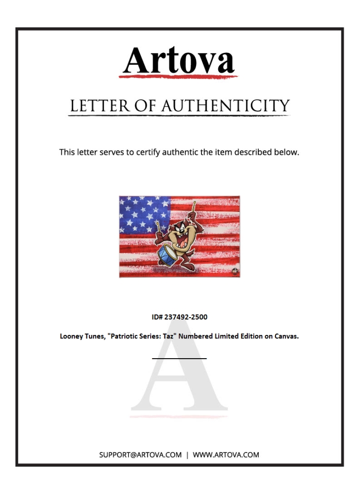 "Patriotic Series: Taz" is a limited edition giclee on gallery wrapped canvas by Looney Tunes. This piece comes from an edition of 250 and bears an imprint of Looney Tunes' official seal. Includes Certificate of Authenticity. Measures approx. 30" x 20" (image)