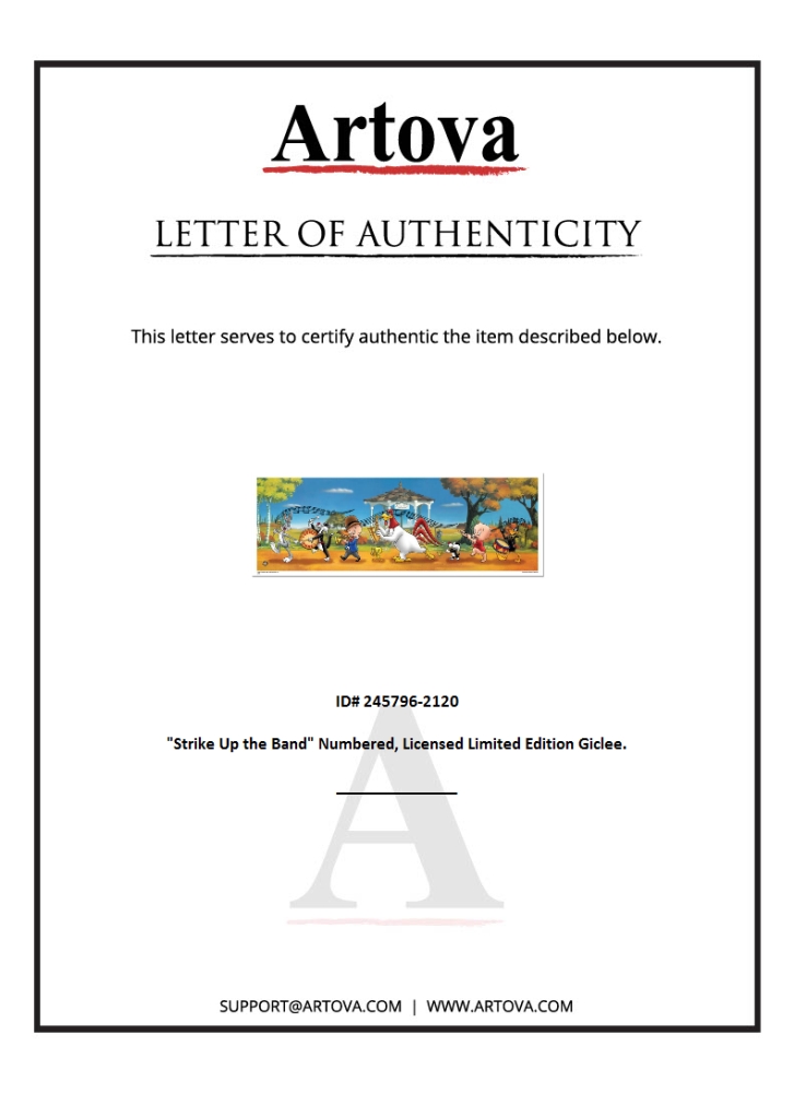"Strike Up the Band" is a licensed limited edition giclee on paper featuring the classic Looney Tunes characters. It comes numbered, with hologram seal, and a Certificate of Authenticity! Measures approx. 16" x 20" (with border), 12" x 16" (image).