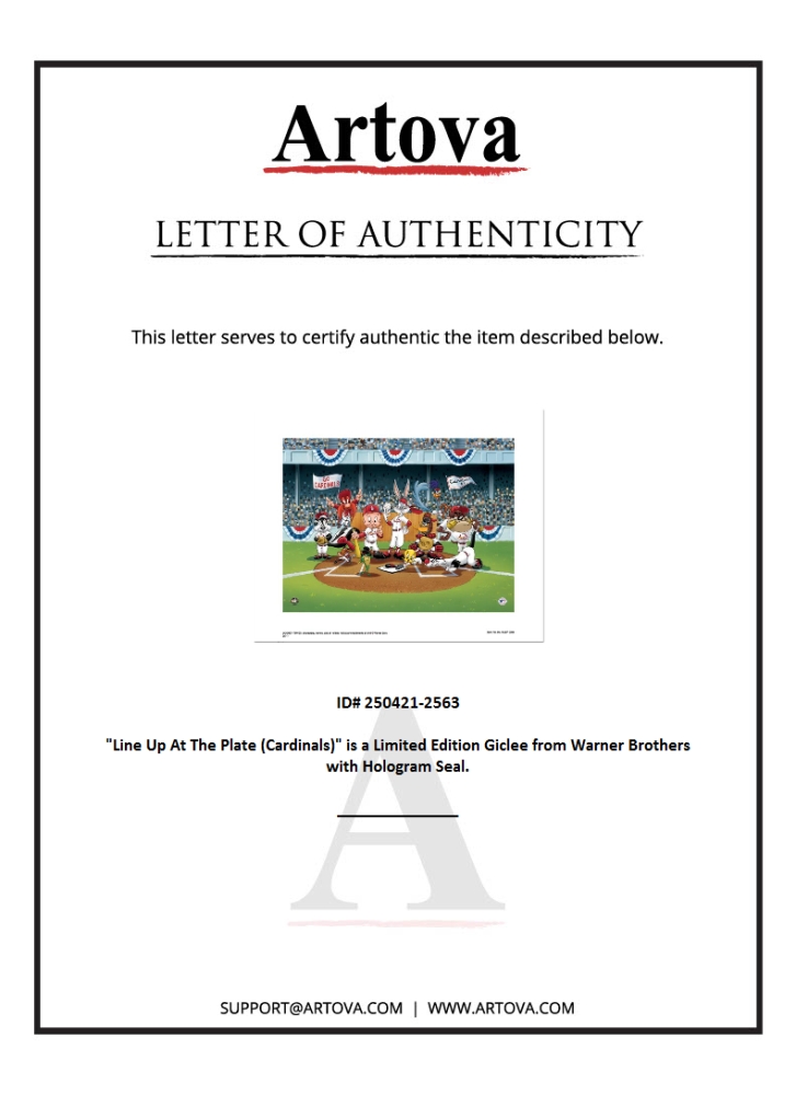 "Line Up At The Plate (Cardinals)" is a limited edition giclee on paper from Warner Brothers featuring iconic Looney Tunes characters in St. Louis Cardinals MLB uniforms. It comes numbered, with hologram seal, and a Certificate of Authenticity. Measures approximately 20" x 16" (with border), 16" x 12" (image).