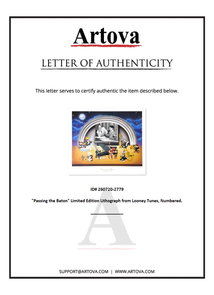 "Passing the Baton" is a numbered limited edition lithograph from Looney Tunes. This piece is a tribute to Mel Blanc (1908-1989), the voice of Bugs Bunny, Daffy Duck and other animated characters, and his son, Noel Blanc took over his father's role when Mel retired. Includes Letter of Authenticity. Measures approx. 30" x 27" (border), 27" x 21" (image).