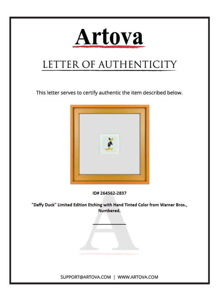 "Daffy Duck" is a limited edition etching on paper with hand tinted coloring from Warner Bros., numbered and dated 1999. This piece comes framed. Measures approx. 9" x 9" (frame), 1.5" x 1" (image).