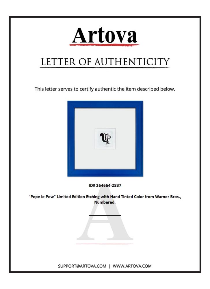 Warner Bros. "Pepe Le Pew" LE 9x9 Custom Framed Etching with Hand-Tinted Coloring (Artova)