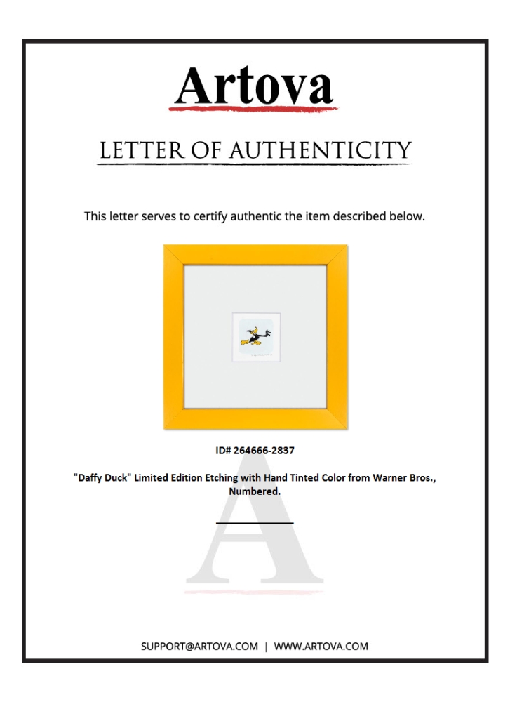 "Daffy Duck" is a limited edition etching on paper with hand tinted coloring from Warner Bros., numbered and dated 1999. This piece comes framed. Measures approx. 9" x 9" (frame), 1" x 1.5" (image).