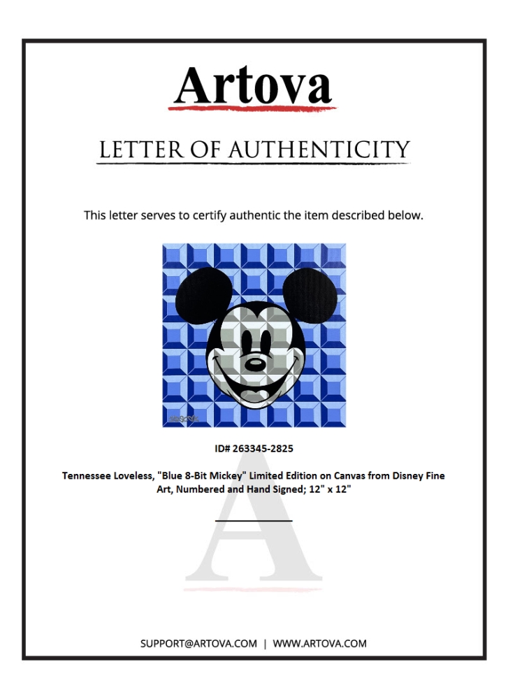"Blue 8-Bit Mickey" is a limited edition giclee on canvas by Tennessee Loveless, numbered and hand signed by the artist. This piece is licensed by Disney Fine Art. Includes Letter of Authenticity. Measures approx. 12" x 12" (image).
