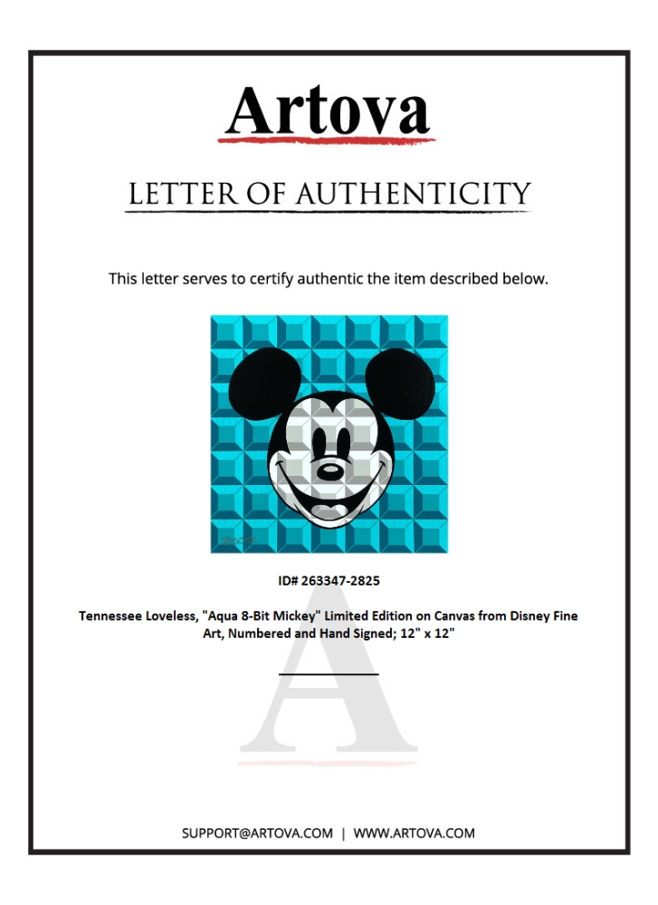 "Aqua 8-Bit Mickey" is a limited edition giclee on canvas by Tennessee Loveless, numbered and hand signed by the artist. This piece is licensed by Disney Fine Art. Includes Letter of Authenticity. Measures approx. 12" x 12" (image).