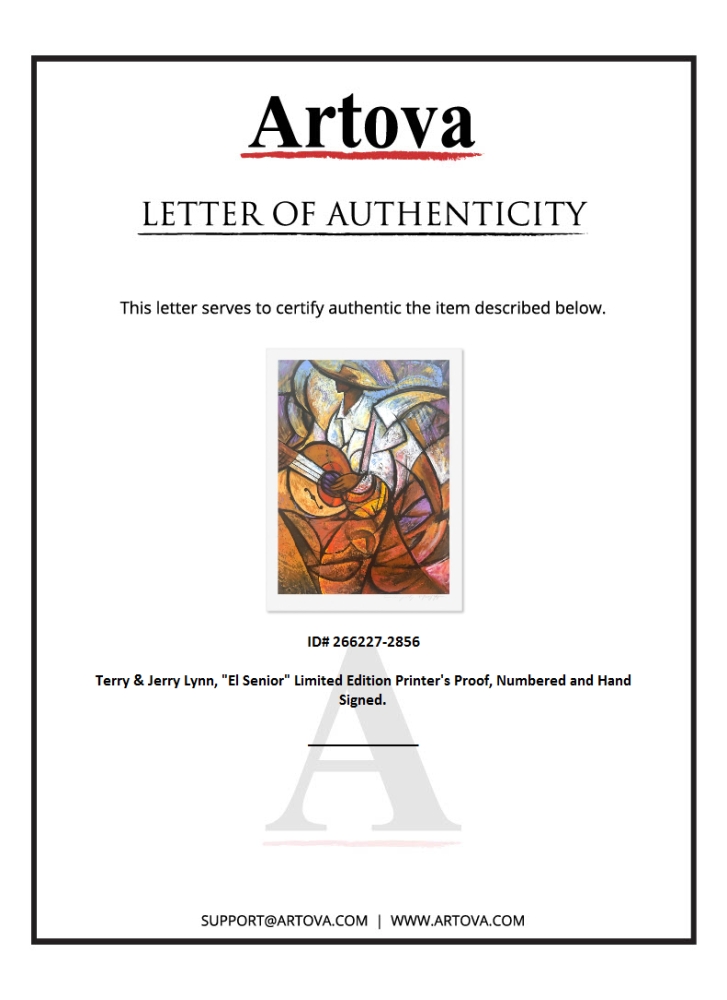 "El Senior" is a limited edition printer's proof serigraph on paper by Terry & Jerry Lynn, numbered and hand signed by the artist. Includes Letter of Authenticity. Measures approx. 42" x 32" (border), 38" x 28" (image).