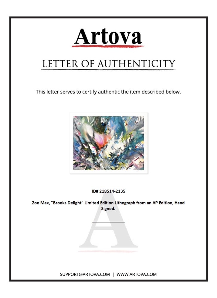 "Brooks Delight" is a limited edition lithograph on paper by Zoe Mac from an AP edition, hand-signed by the artist. Includes Letter of Authenticity. Measures approx. 29.5" x 23" (border), 26" x 20" (image). Please note: there may be minor wear on the corners and edges.