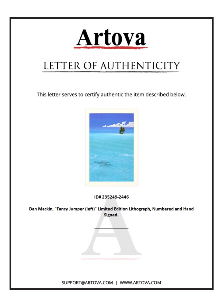 "Fancy Jumper (left)" is a limited edition lithograph on paper by Dan Mackin, numbered and hand-signed by the artist. Measures approx. 12" x 16" (border), 10" x 14" (image).