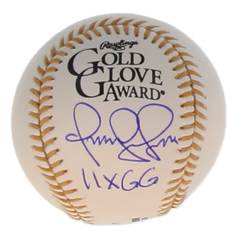 Rawlings Gold Glove Award baseball has been hand-signed and inscribed by Omar Vizquel (Cleveland Indians).
