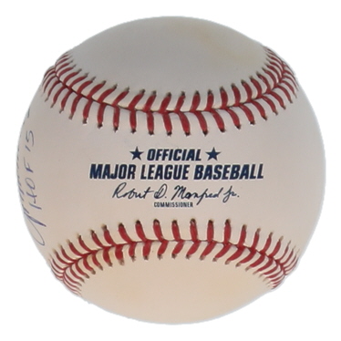 Rawlings Official Major League Hall of Fame Logo Baseball. Hand-signed and inscribed by John Smoltz (Atlanta Braves, HOF). Please note, there are stains throughout the baseball.