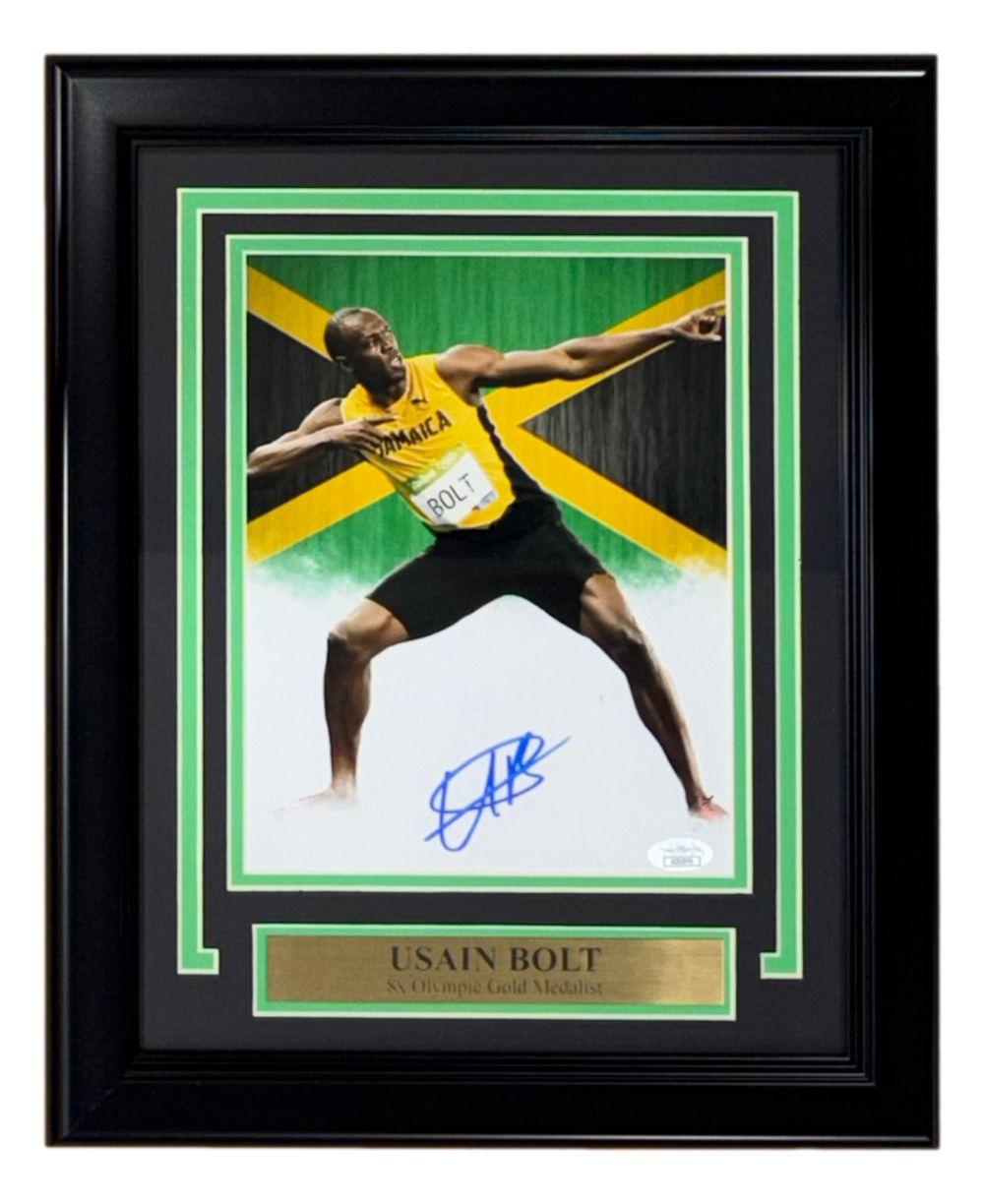 Custom frame measures 11” x 14” in size and features a photo that has been hand-signed by Usain Bolt.