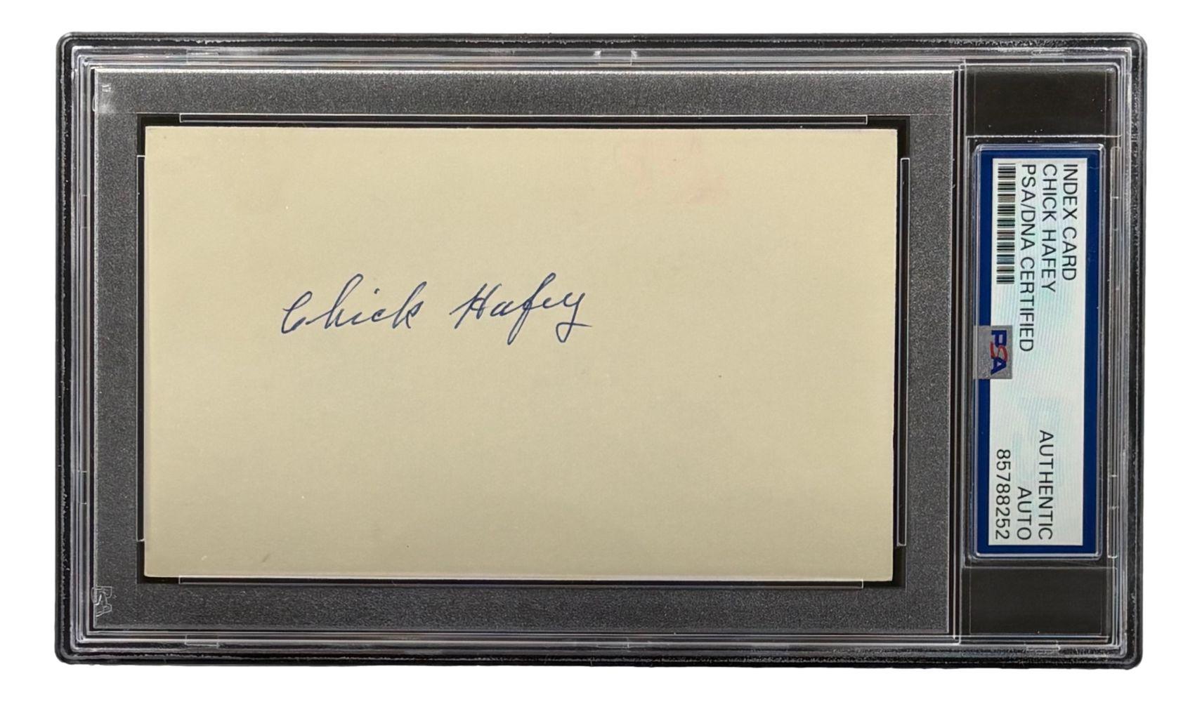 Index Card measures 3” x 5” in size and has been hand-signed by Chick Hafey (D. 1973, St. Louis Cardinals, HOF).