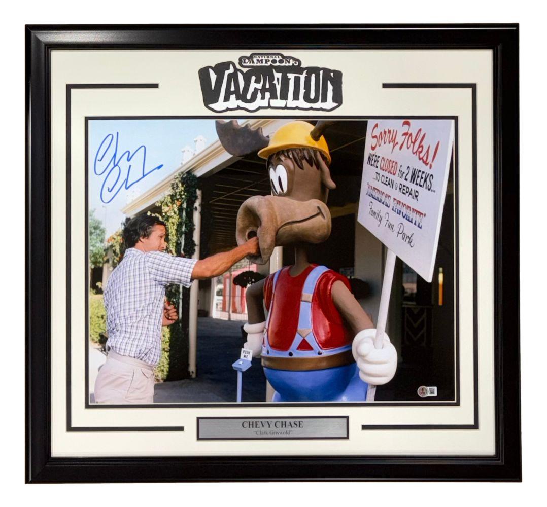 Custom frame measures 24” x 26” in size and features a photo that has been hand-signed by Chevy Chase.