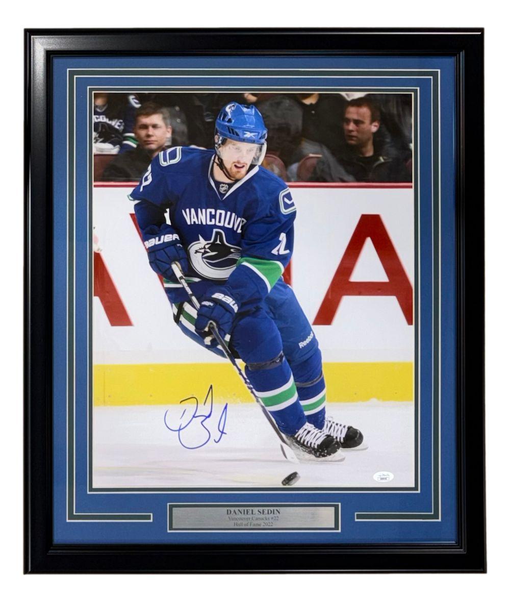 Custom frame measures 22” x 27” in size and features a photo that has been hand-signed by Daniel Sedin (Vancouver Canucks).