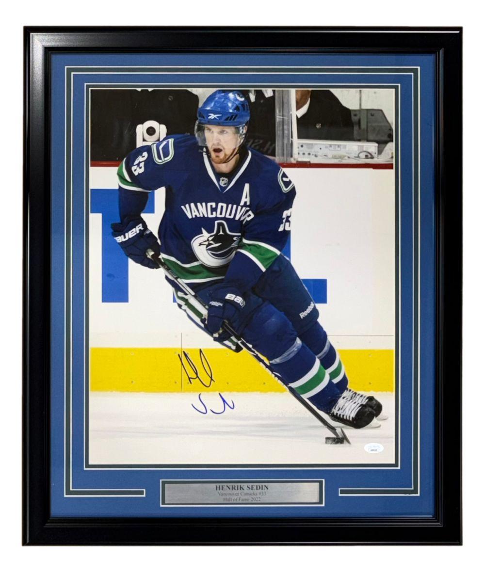 Custom frame measures 22” x 27” in size and features a photo that has been hand-signed by Henrik Sedin (Vancouver Canucks).
