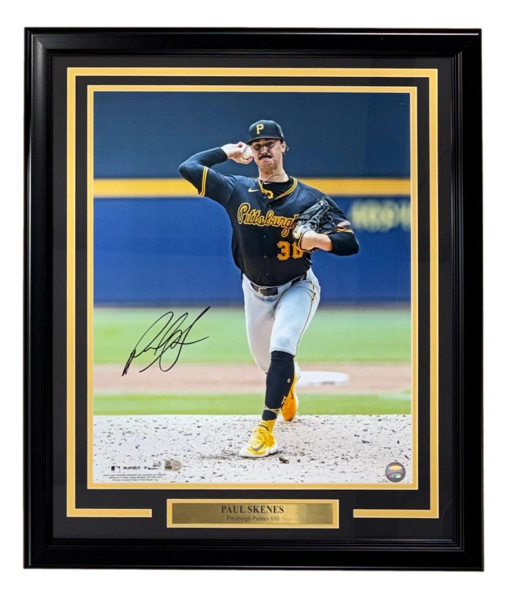 Custom frame measures 22” x 27” in size and features a photo that has been hand-signed by Paul Skenes (Pittsburgh Pirates).