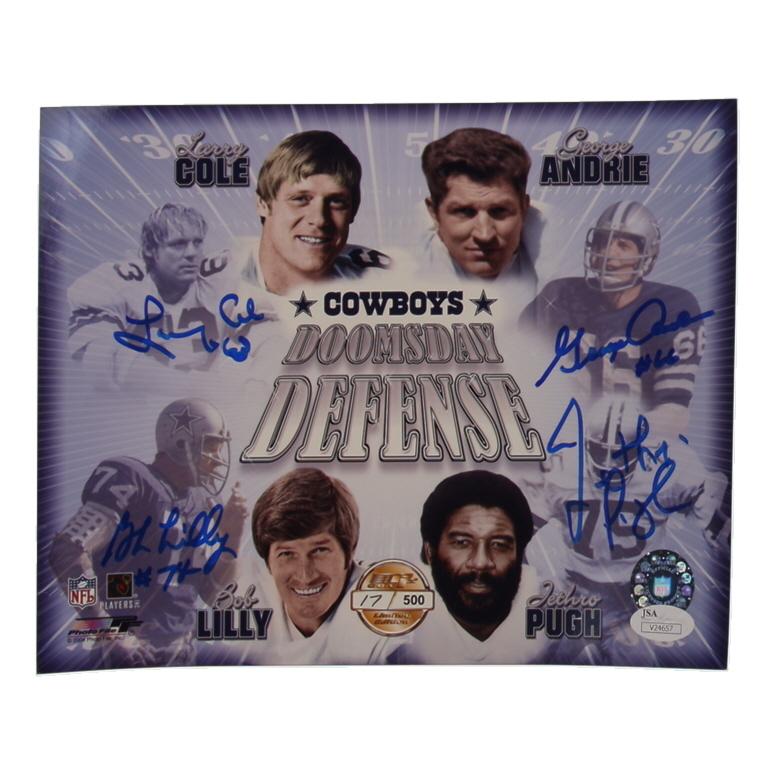 Photo measures 8" x 10" in size. Hand-signed by Larry Cole, George Andrie, Jethro Pugh and Bob Lilly (Dallas Cowboys, HOF). Limited edition #17/500.