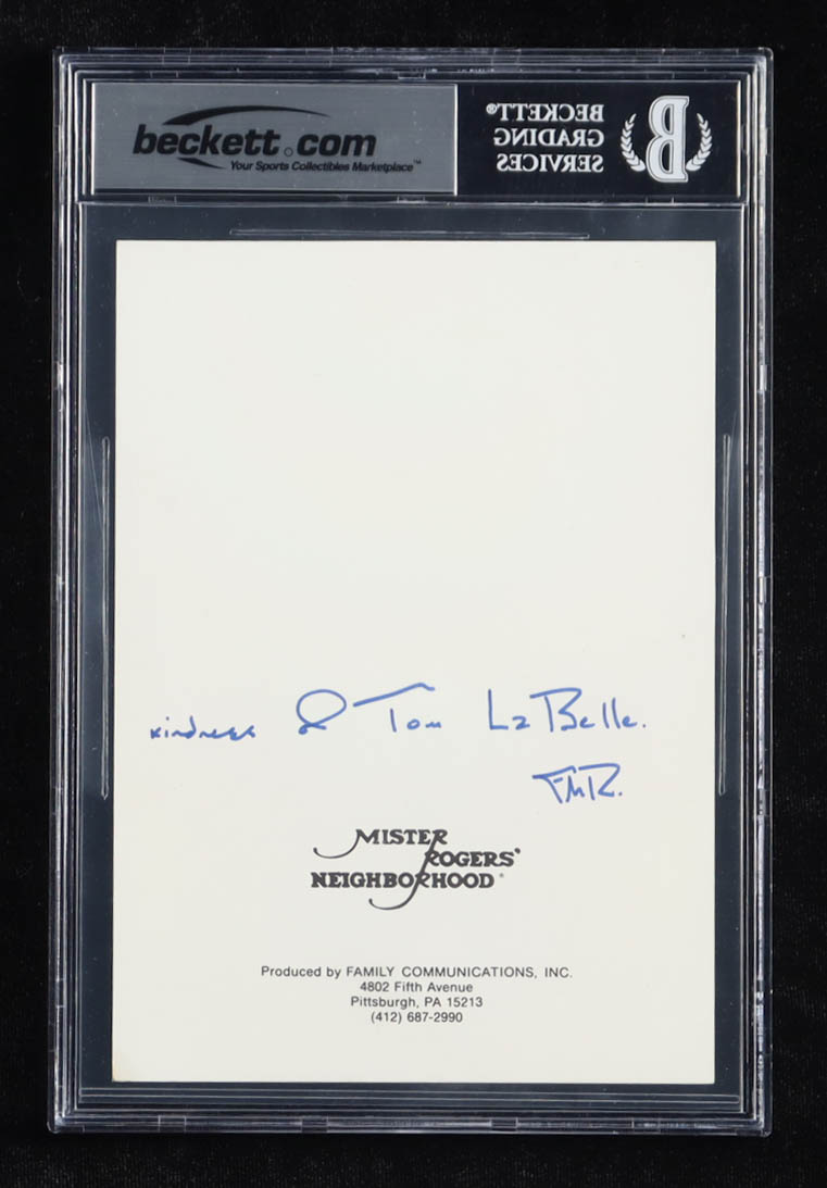 Photo measures 5" x 7" in size and has been hand-signed and inscribed by Fred Rogers (D. 2003). Please note, the photo is personalized to an unknown person and includes a additional photo overlay on the front.