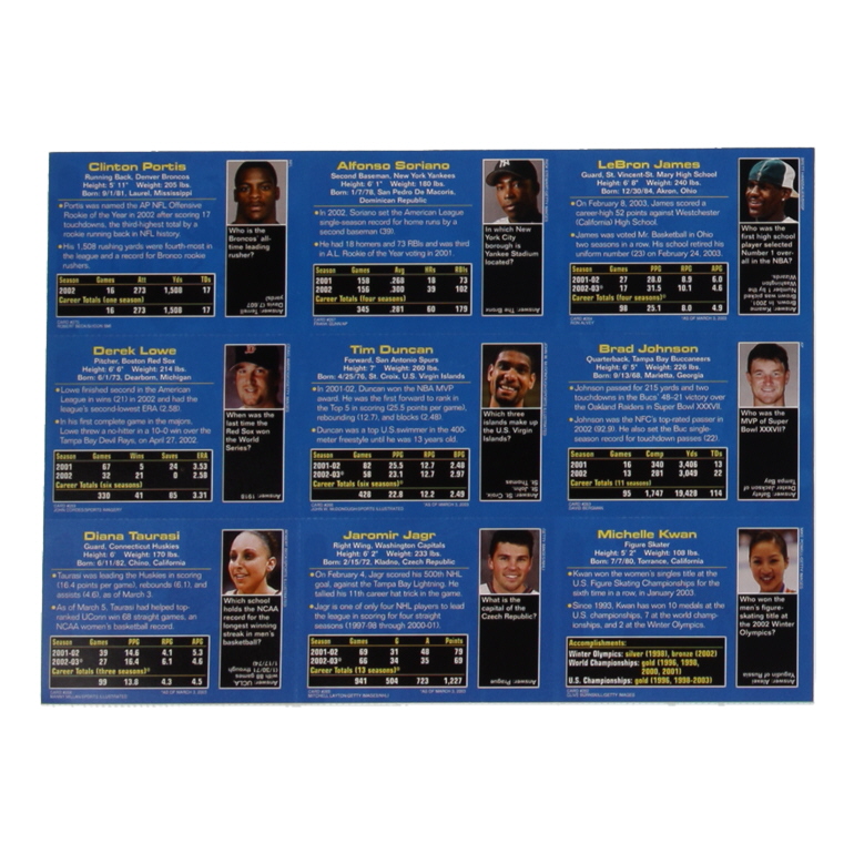 2003 Sports Illustrated for Kid Uncut Sheet of (9) Cards with LeBron James RC, Tim Duncan, Michelle Kwan, Diana Taurasi RC