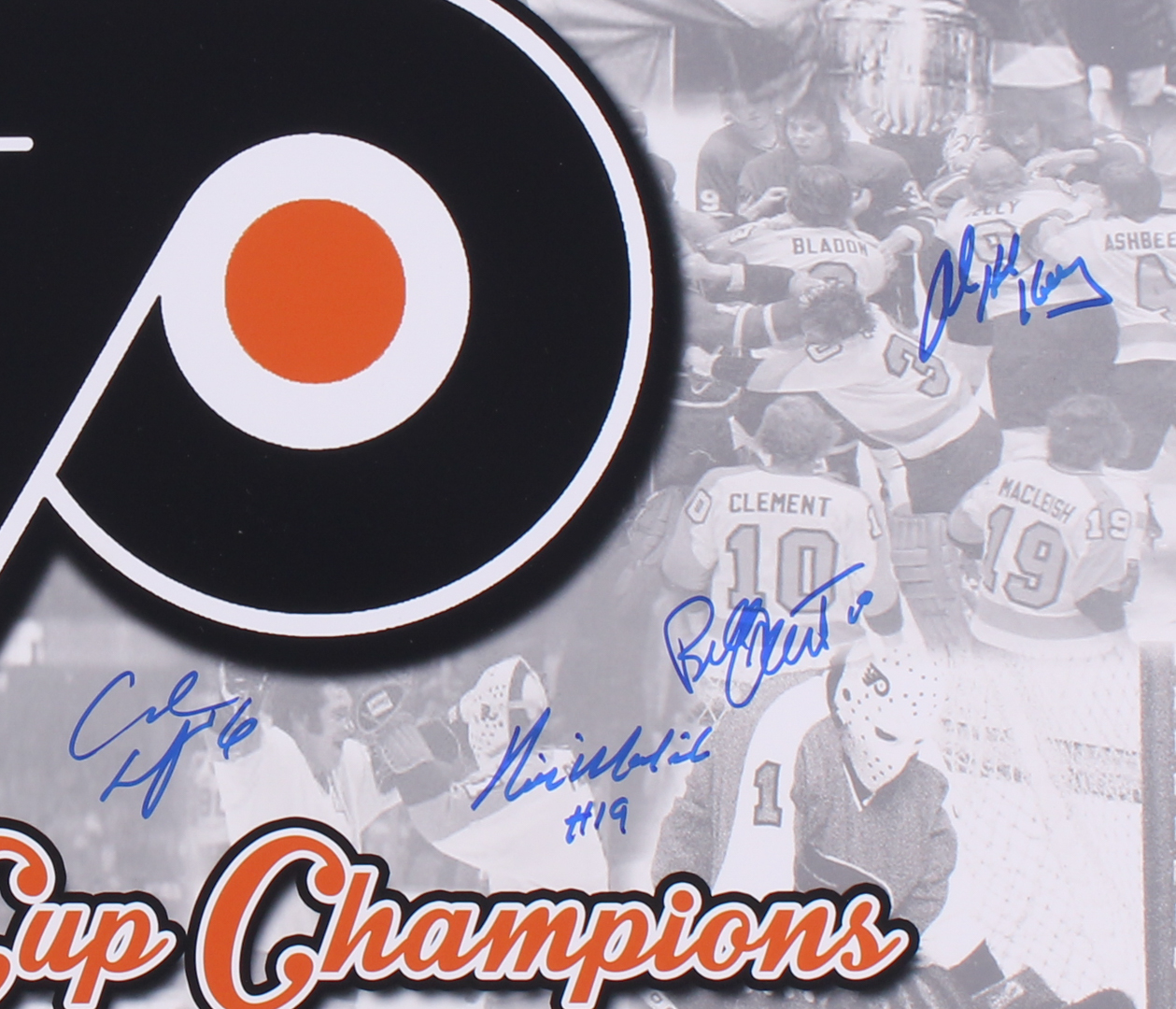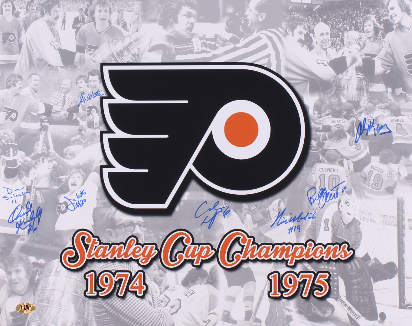Photo measures 16" x 20" and has been hand signed by (8) with Orest Kindrachuk, Jimmy Watson, Rick MacLeish (D. 2016), Bill Clement, Andre Dupont and (3) others.